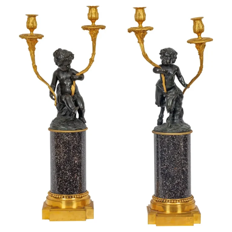 A Magnificent Pair of Louis XVI Style Gilt Bronze Candelabra on Porphyry Bases
