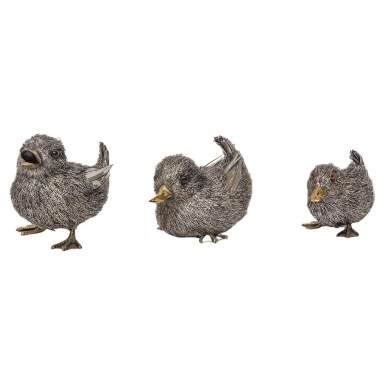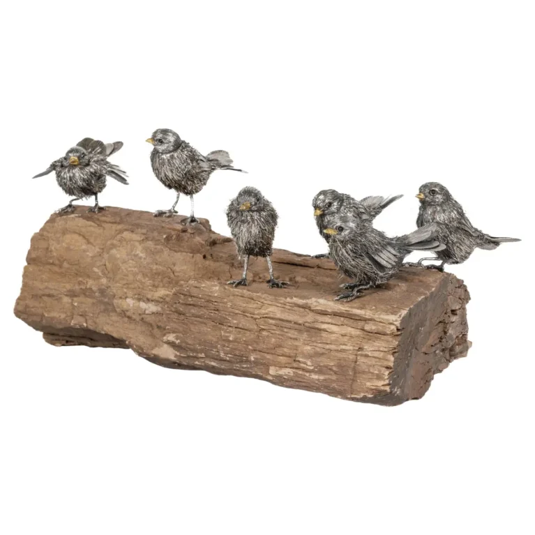 Adorable Family of Six Buccellati Sterling Silver Furry Chicks on Petrified Wood