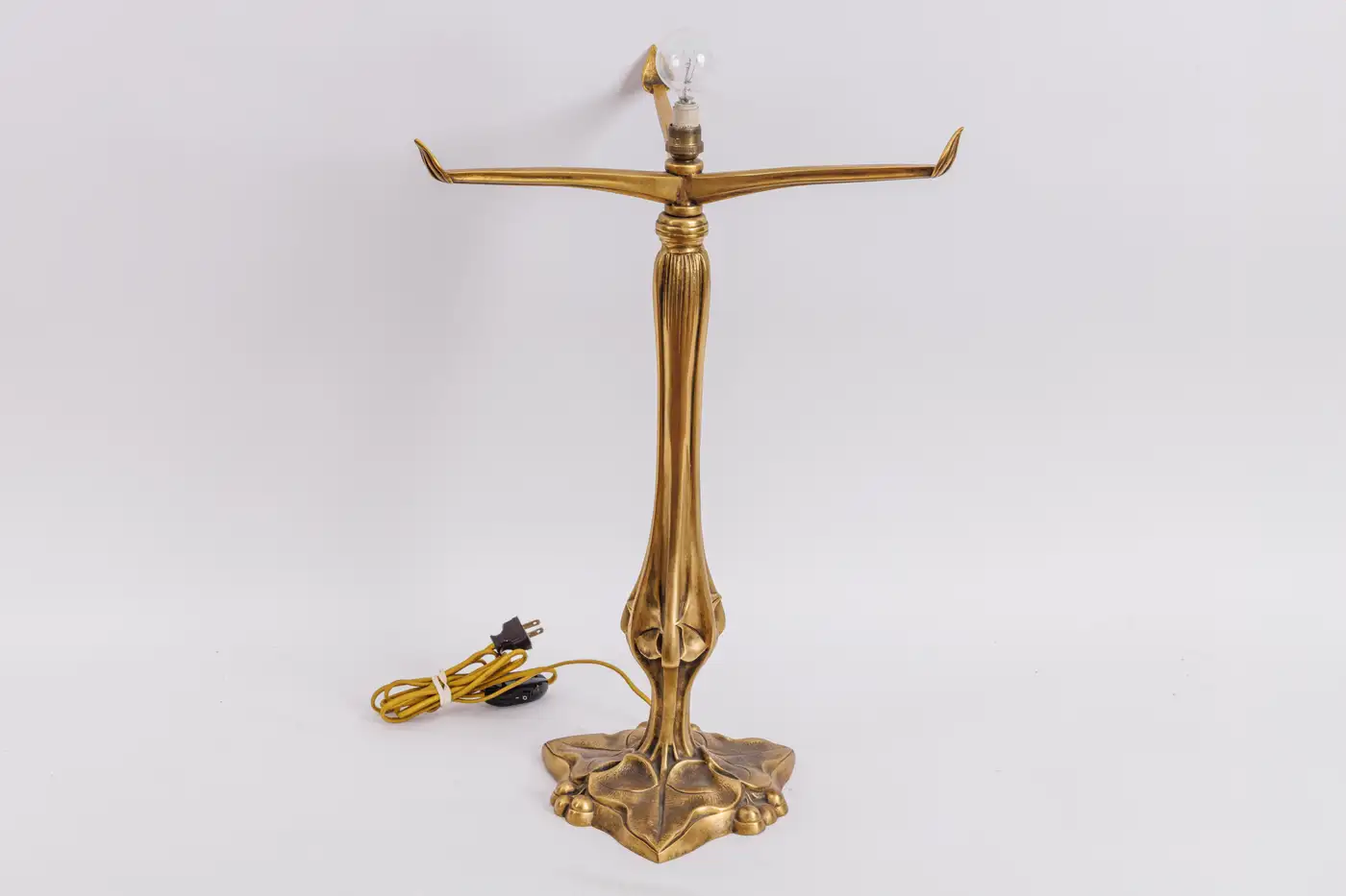 - Crafted with meticulous attention to detail, the lamp boasts a mesmerizing blend of gilt bronze and delicate pink glass. The organic forms and intricate floral motifs characteristic of the Art Nouveau movement are beautifully showcased in the sculpted bronze base, adorned with graceful curves and botanical embellishments.