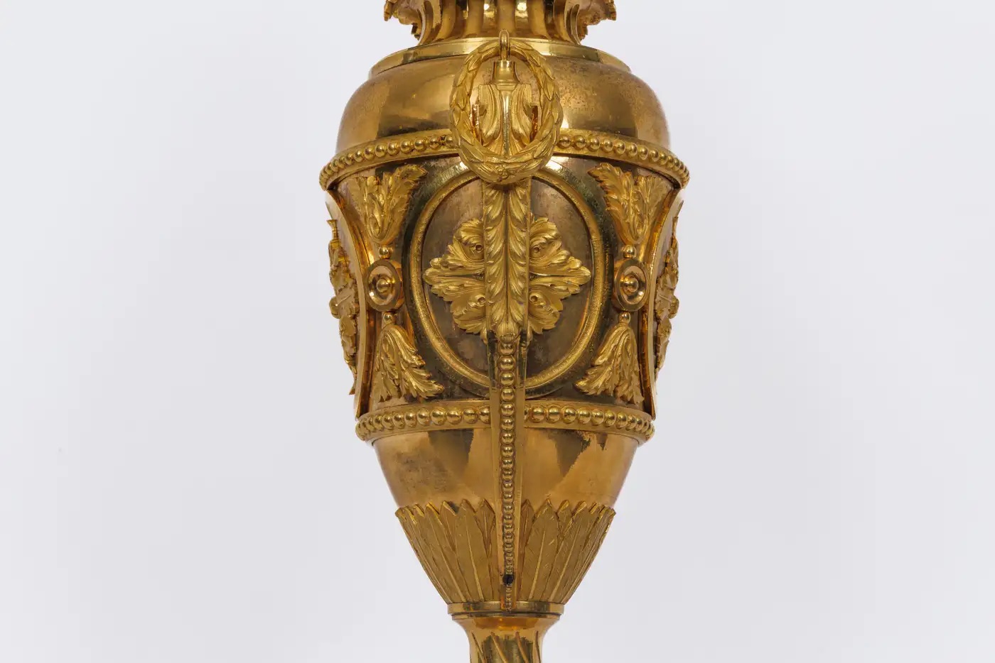 - The vases taper gracefully into acanthus-wrapped socles, raised on contrasting black bases that highlight the brilliance of the fire-gilt ormolu. Their refined proportions, crisp chasing, and luminous gilding capture the elegance and grandeur associated with the finest French craftsmanship of the Louis XVI period.