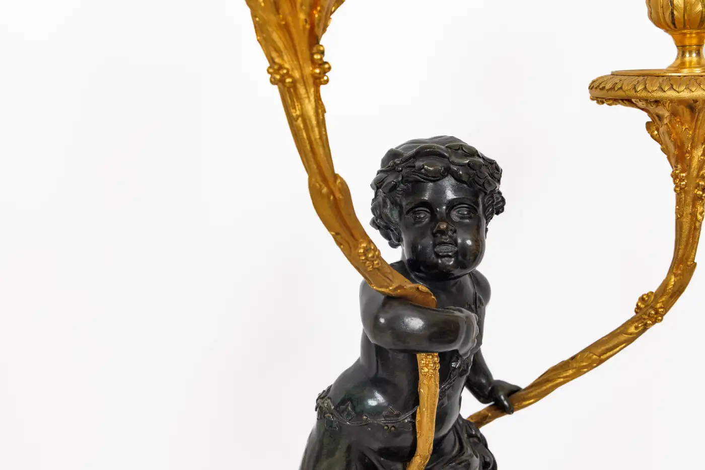 - An exceptional and imposing pair of French Louis XVI style gilt and patinated bronze two-light candelabra, finely cast after designs by Claude Michel, known as Clodion (1738–1814). Each candelabrum is masterfully modeled with classically draped figures in patinated bronze, holding aloft scrolling gilt bronze candle arms terminating in acanthus-wrapped nozzles and drip pans. The dramatic contrast between the warm, rich gilding and the dark patination underscores the extraordinary detail and sculptural quality throughout.