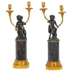 - This grand pair exemplifies the refinement and opulence of the Louis XVI aesthetic, merging the sculptural genius of Clodion’s designs with the Neoclassical grandeur of porphyry. Comparable examples can be found in the collections of leading institutions underscoring both the rarity and desirability of such works.