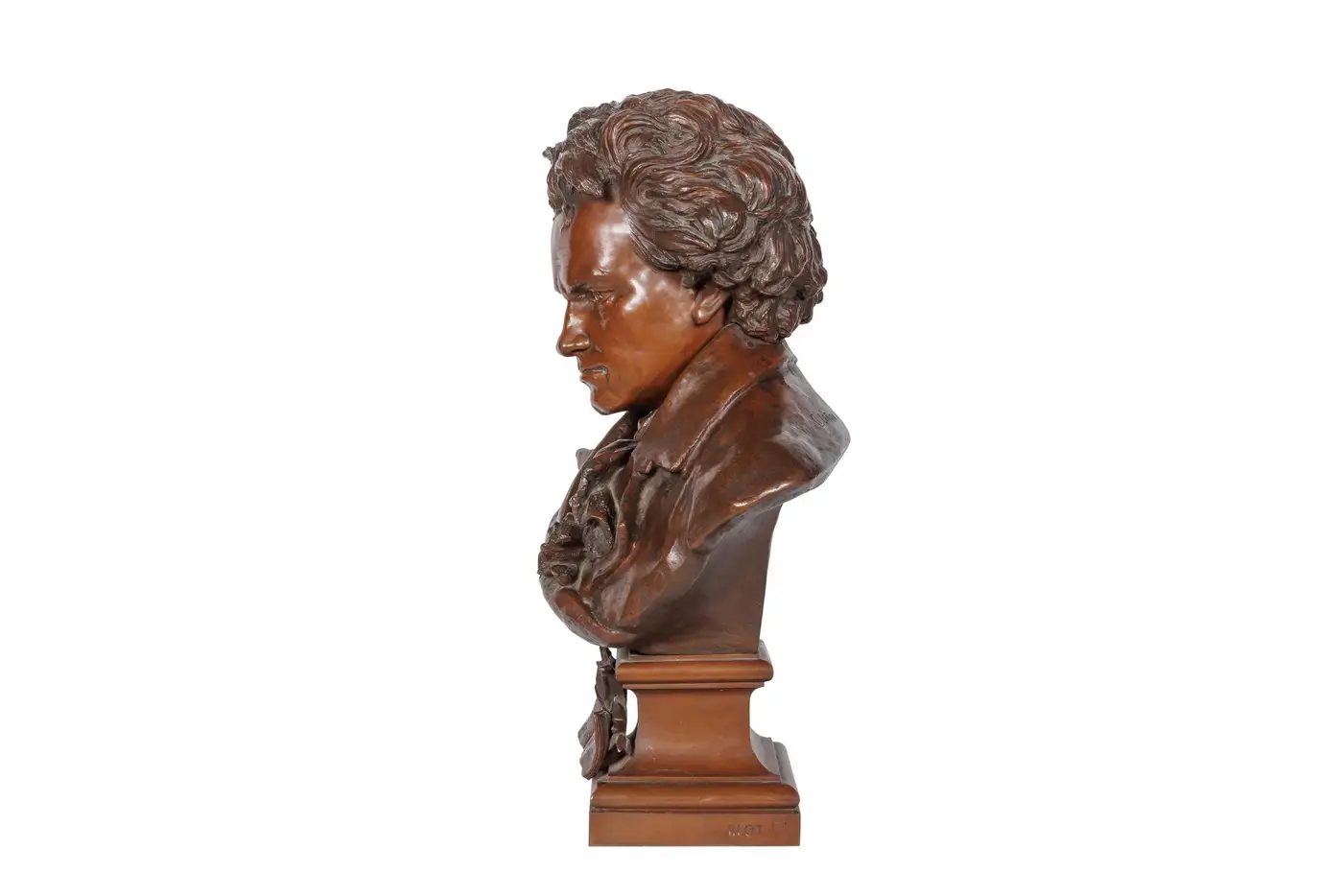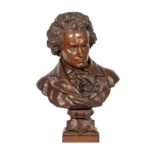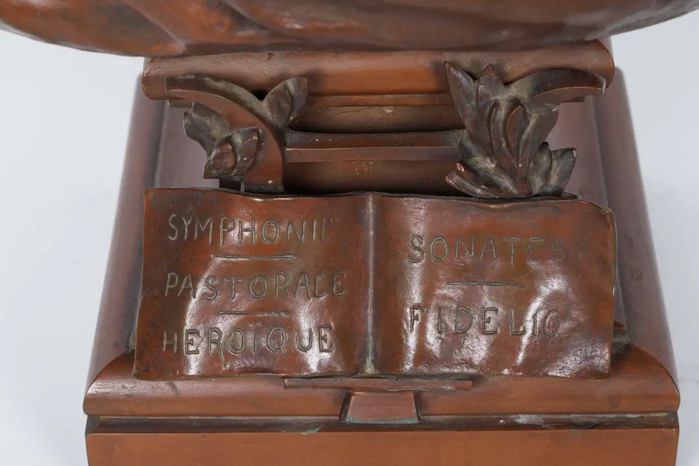 - This magnificent sculpture powerfully captures the iconic composer in deep contemplation, adorned in a coat with wide lapels and a ruffled shirt, exuding timeless grandeur. Beethoven’s intense expression reflects the profound spirit and emotion of his music. At the foot of this striking piece lies an open book, inscribed with the titles “Symphonie Pastorale, Heroique, Sonates, Fidelio,” symbolizing some of his greatest works, flanked by two small laurels, emblematic of his triumphs and legacy. The rich patina enhances the lifelike depth and texture, making this piece a commanding centerpiece for connoisseurs of fine art and classical music enthusiasts alike.
