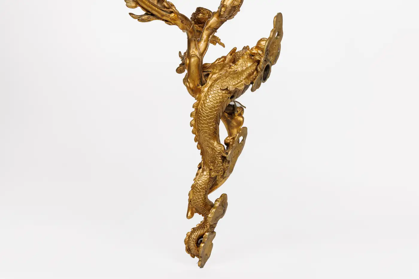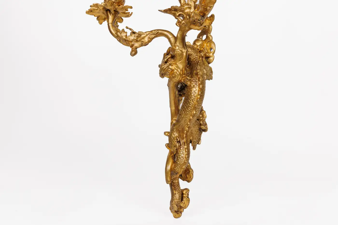 - Exuding the opulent allure of 19th-century Japonisme, this exquisite pair of three-light dragon bronze wall appliques is attributed to the celebrated French designer Edouard Lièvre. Masterfully cast in gilt bronze, these appliques showcase intricate dragon motifs, embodying a harmonious fusion of East Asian artistry and French decorative sophistication.