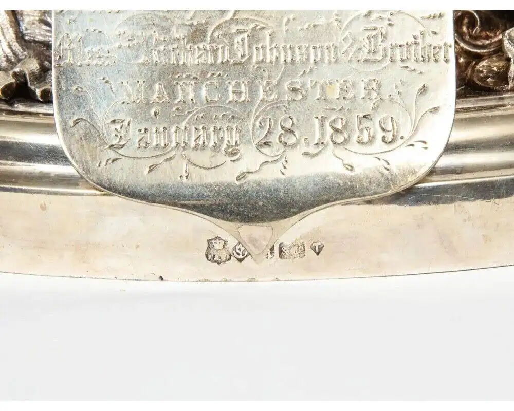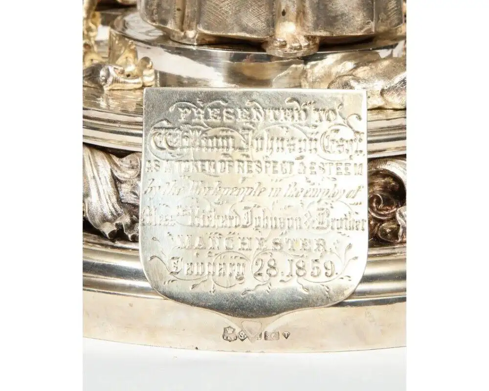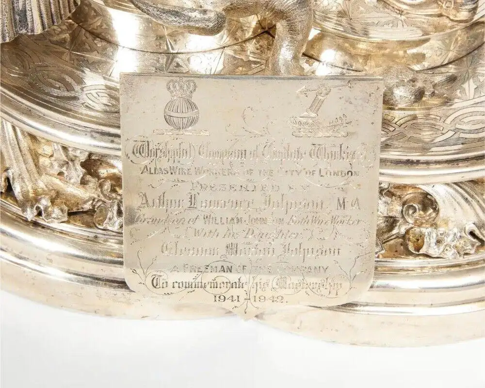 - Adding profound historical value are two engraved plaques. The first, dated “January 28, 1859,” reads: “Presented to William Johnson Esq. as a token of respect & esteem by the workpeople in the employ of Messrs Richard Johnson & Brother, Manchester.” The second, an inscription from 1941, states: “Worshipful Company of Tin Plate Workers, Alias Wire Workers of the City of London, Presented by Arthur Laurence Johnson M.A., Grandson of William Johnson, both Wire Workers, with his Daughter Eleanor Morton Johnson, a Freeman of the Company, to commemorate his Mastership 1941-42.”