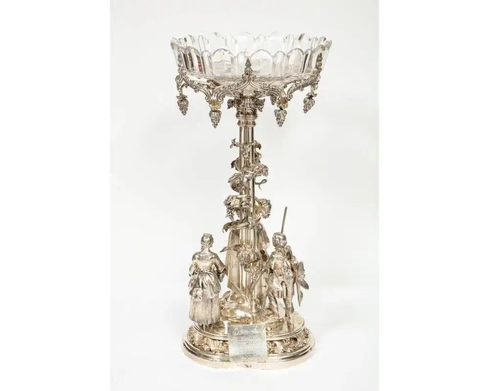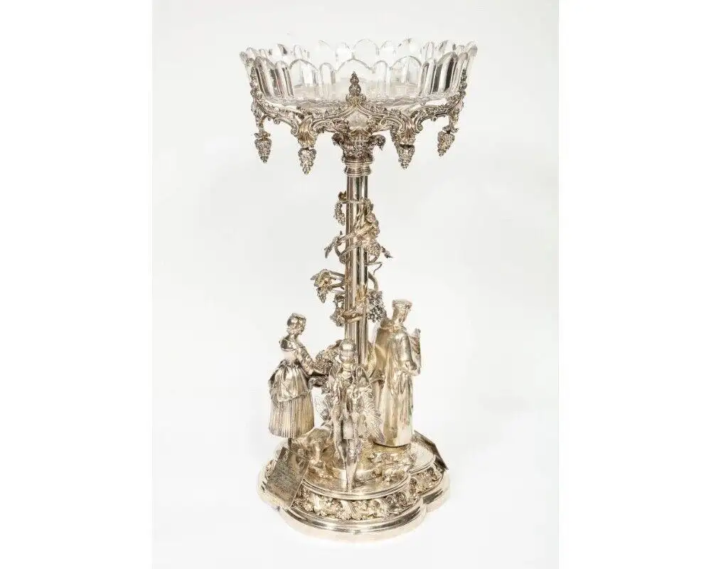 - Presenting a magnificent Victorian silvered bronze centerpiece of unmatched rarity and importance, crafted by the renowned Elkington Mason & Co., Birmingham, in 1859. This exceptional work, complete with its original cut-glass bowl, epitomizes 19th-century British craftsmanship and artistry. Hallmarked to the base, this centerpiece showcases intricate sculptural details, embodying a high level of technical prowess and aesthetic refinement characteristic of Elkington’s celebrated works.