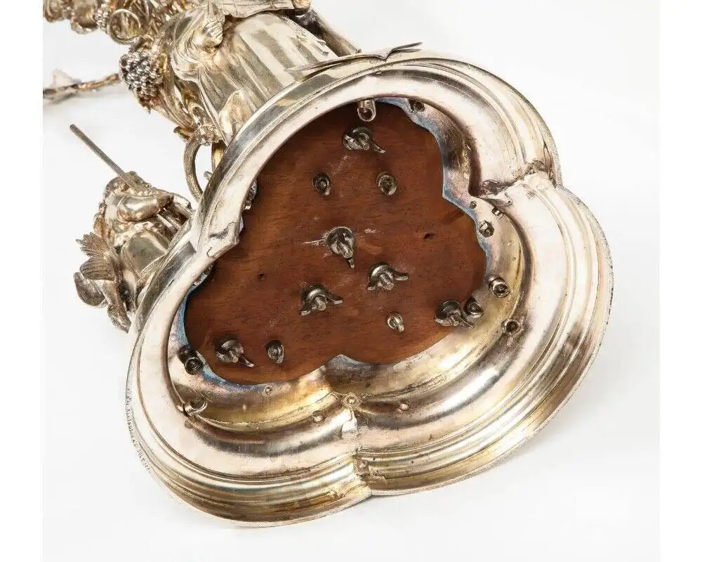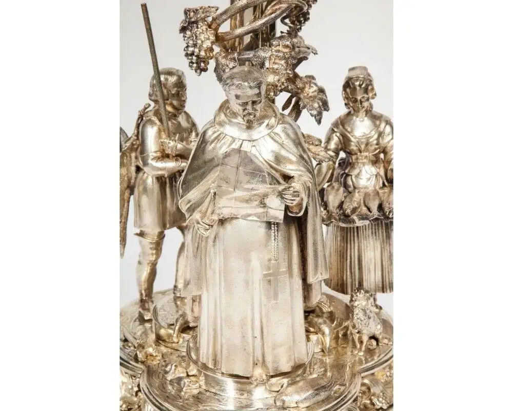 - The centerpiece’s striking design features three meticulously rendered figures—a young hunter, a friar, and a fishmonger—each embodying elements of Victorian life and industry. At their feet, a loyal spaniel and various game highlight the naturalistic approach to the composition, enhanced by the masterful chasing and dynamic form. This sculptural ensemble rests on an elaborately decorated base, exuding both grandeur and narrative depth.