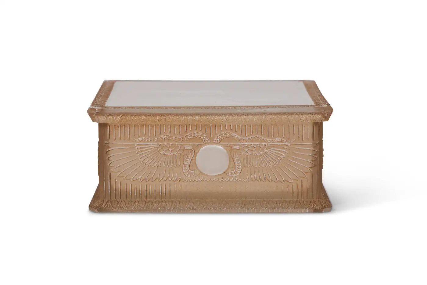• Signed ‘R. LALIQUE’ to the lid, this refined objet d’art reflects Lalique’s unparalleled ability to harmonize material innovation with historical reverence. This box stands as an exceptional example of early 20th-century glasswork, where the aesthetic ideals of Art Deco converge with the grandeur of Egyptian heritage.