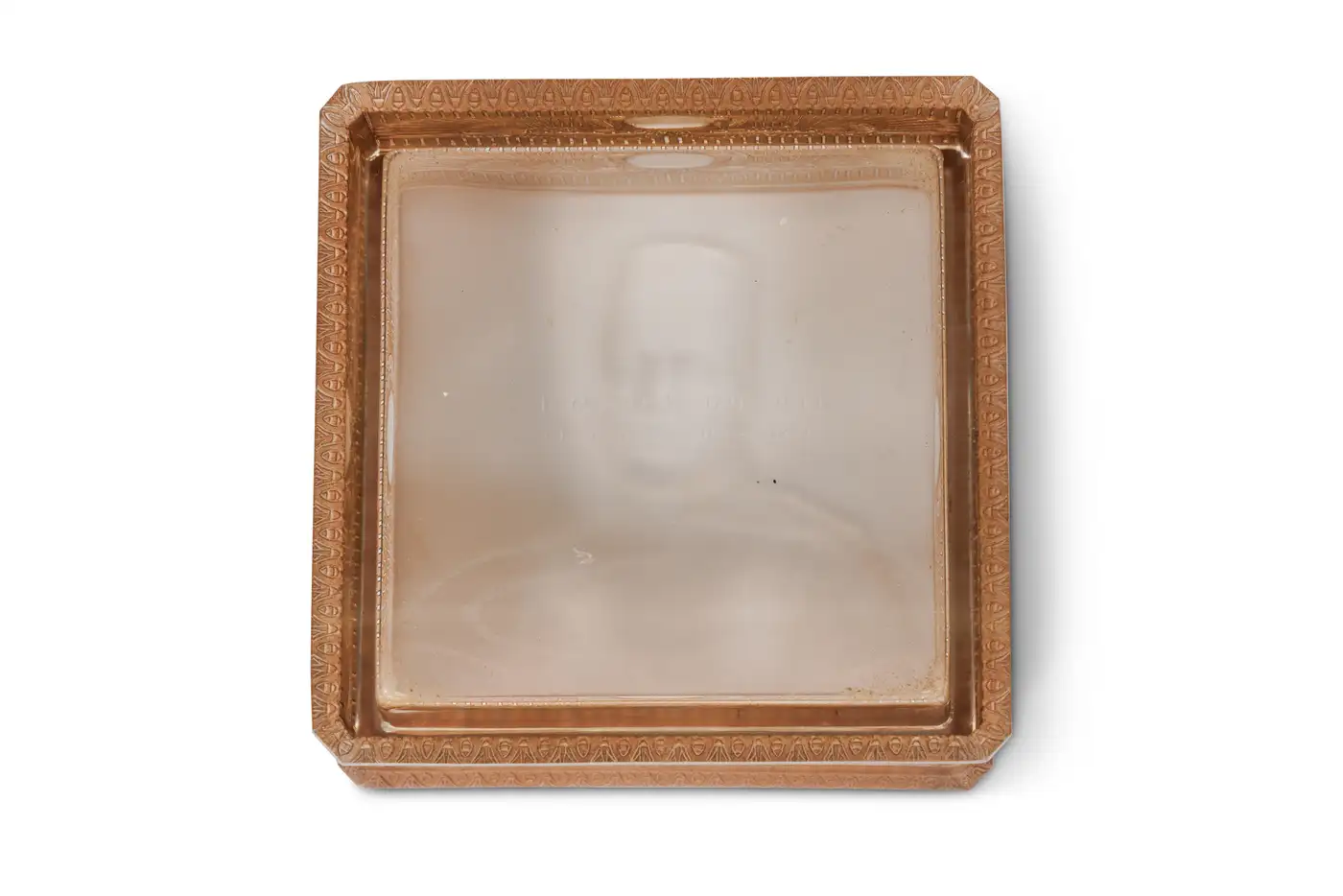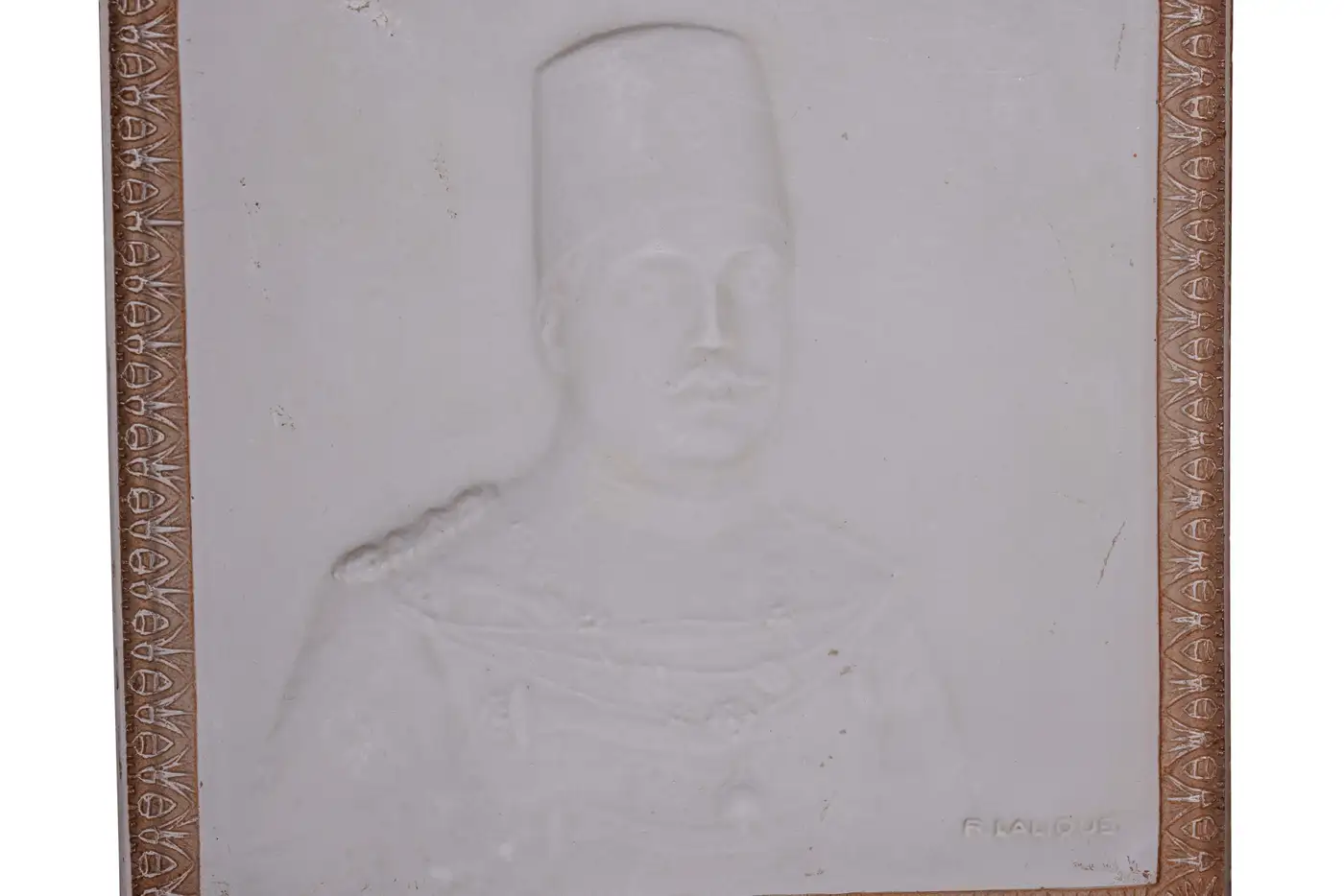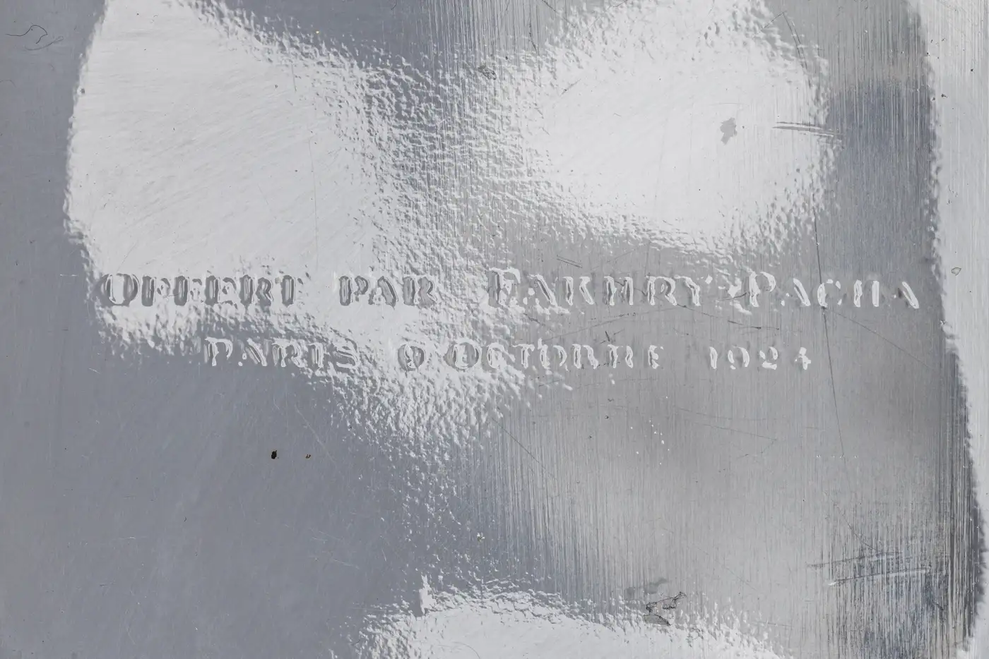 • The frosted lid bears a distinguished engraving of King Fouad I of Egypt, his state portrait rendered with remarkable precision, underscoring both his sovereign authority and the modern aspirations of his reign. A dedication inscribed on the base—”Offert par Fakhry Pacha à Paris le 9 Octobre 1924″—further contextualizes the piece within the realm of diplomatic and ceremonial gifting, situating it as a testament to cross-cultural exchange and early 20th-century Franco-Egyptian relations.