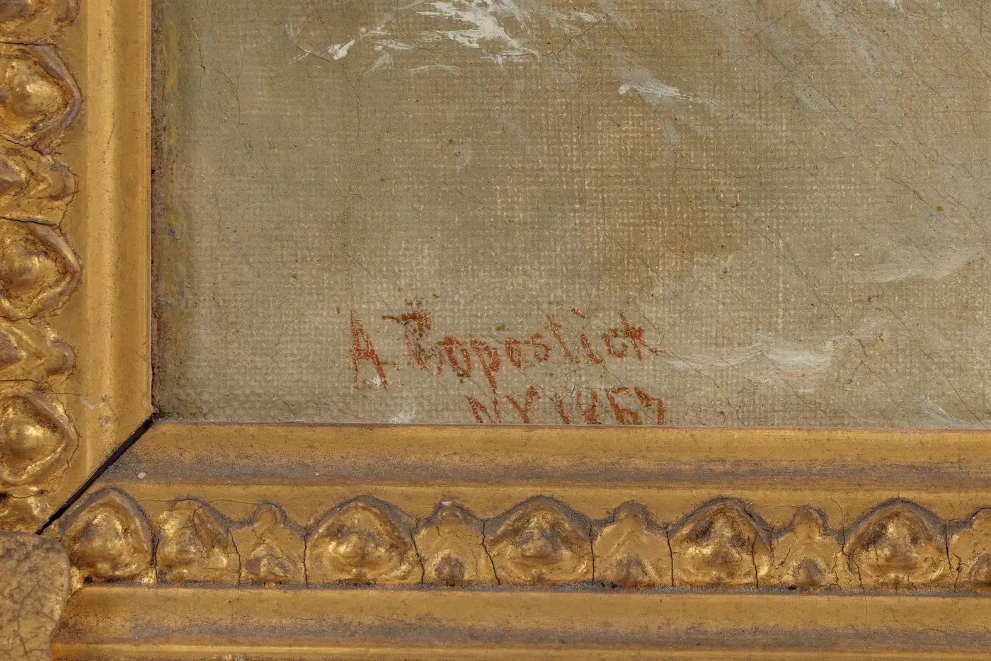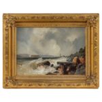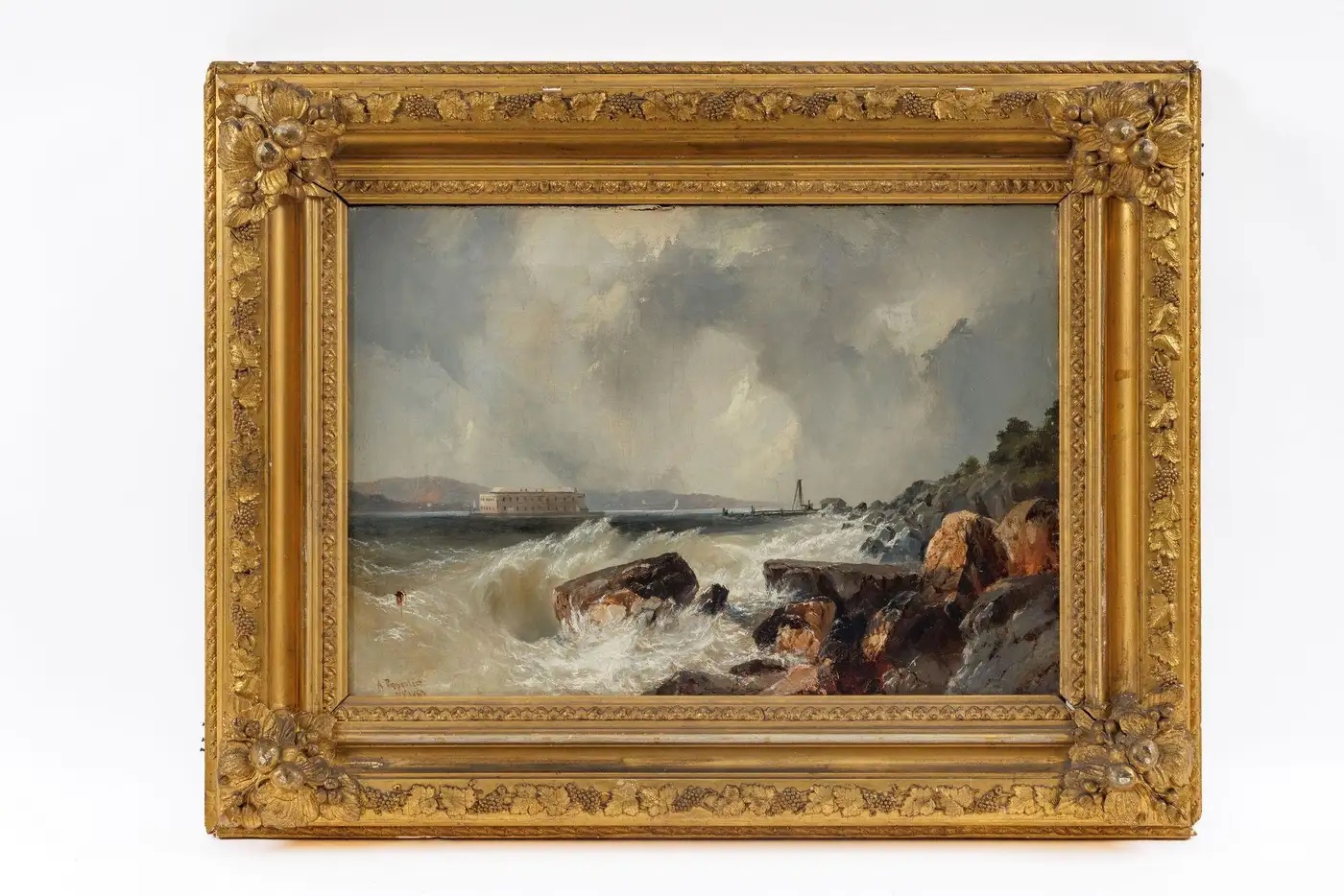 - The painting is a remarkable marriage of documentary precision and romantic sensibility. The young artist’s brush imbues the fortress with weight and presence, yet the broader scene is alive with the transience of weather and the ceaseless motion of the sea. In its original giltwood frame, richly carved and preserving the period character, the canvas is a rare survival of a gifted hand cut short in its prime.
