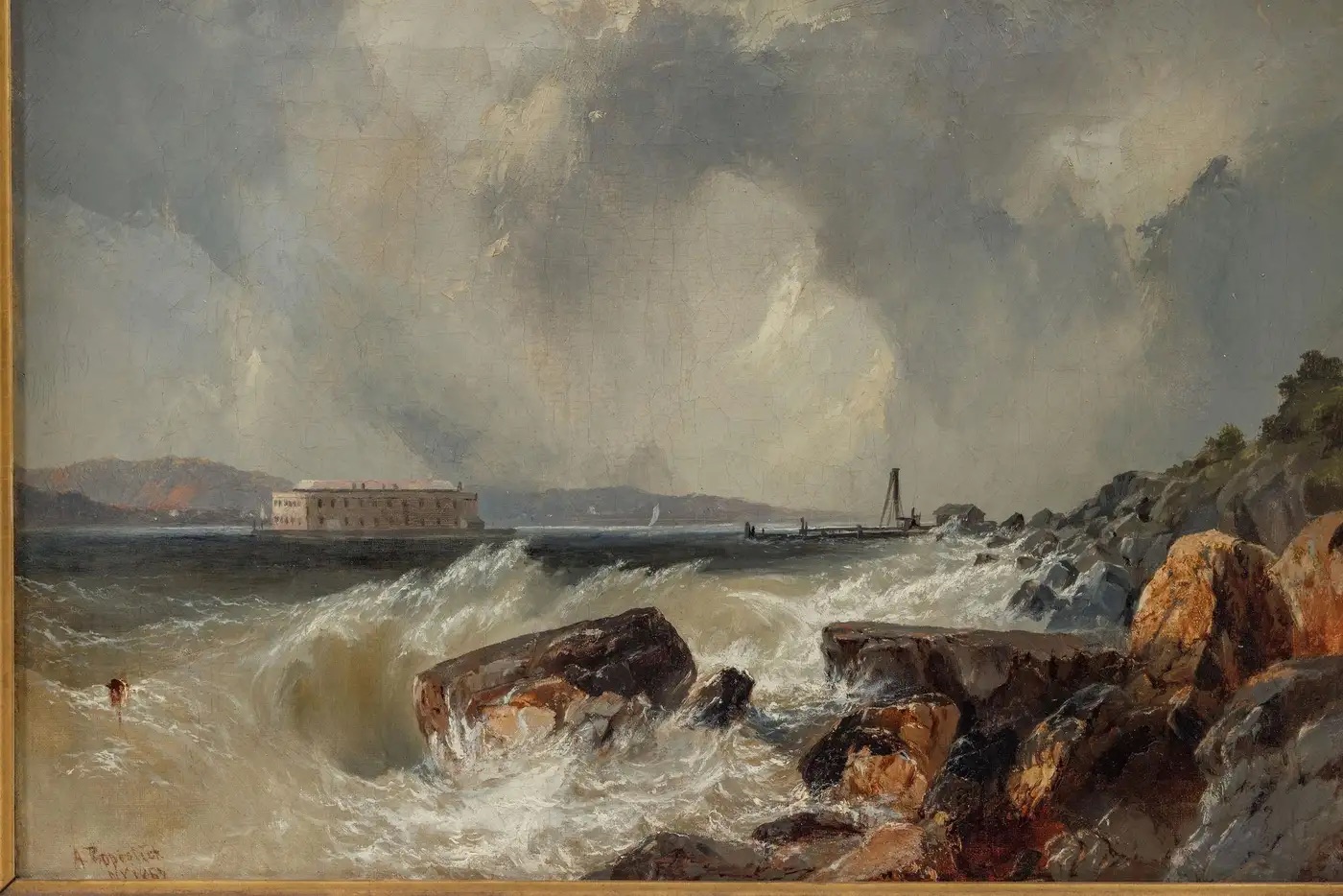 - This canvas reveals Copestick’s deep engagement with the maritime traditions of American art. The careful delineation of sailing vessels recalls the precision of James E. Buttersworth, while the atmospheric breadth echoes the influence of Fitz Henry Lane and John F. Kensett. The choice of subject — the strategic Narrows and its fortress — also reflects the national mood of the 1850s, when American identity was bound up with its coasts, harbors, and defenses.