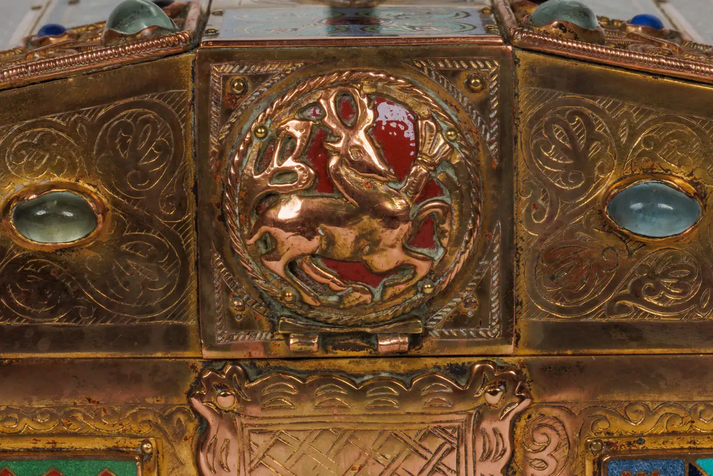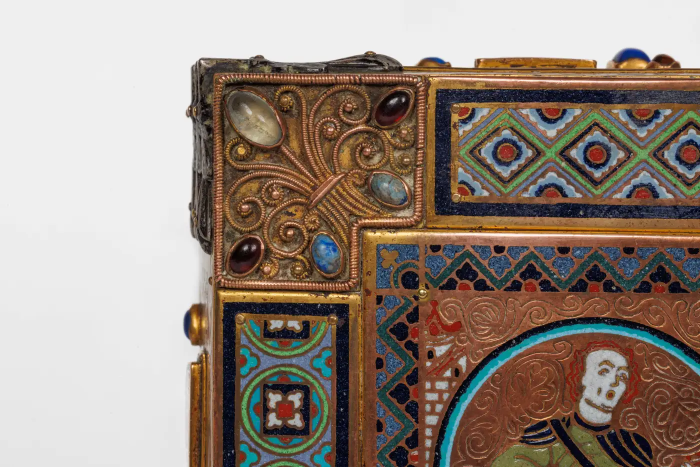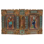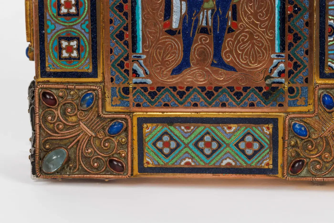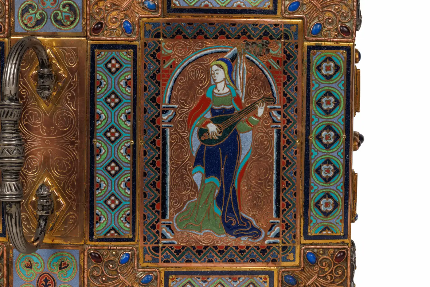 - Surrounding these central panels are ornate silvered bronze accents and a series of enamel medallion plaques, intricately detailed and set throughout the border, further enhancing the piece’s visual appeal. The exceptional use of semi-precious stones—moonstone, lapis lazuli, garnets, and amethyst—adds a touch of opulence, creating a stunning interplay of color and texture that makes this humidor a true work of art.