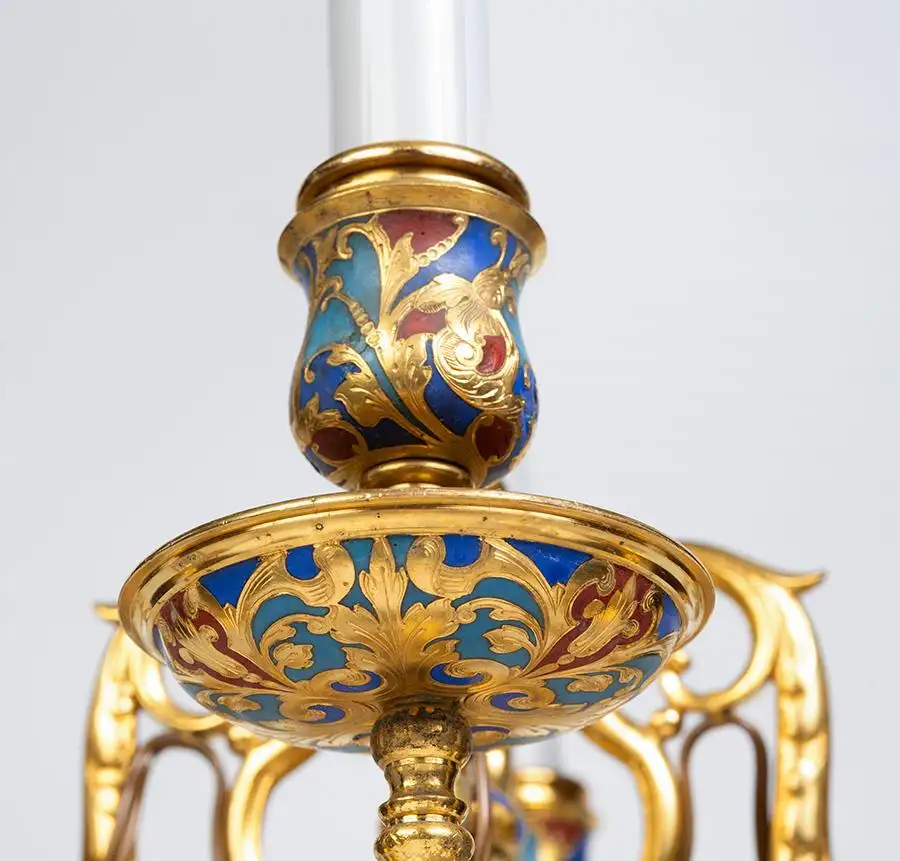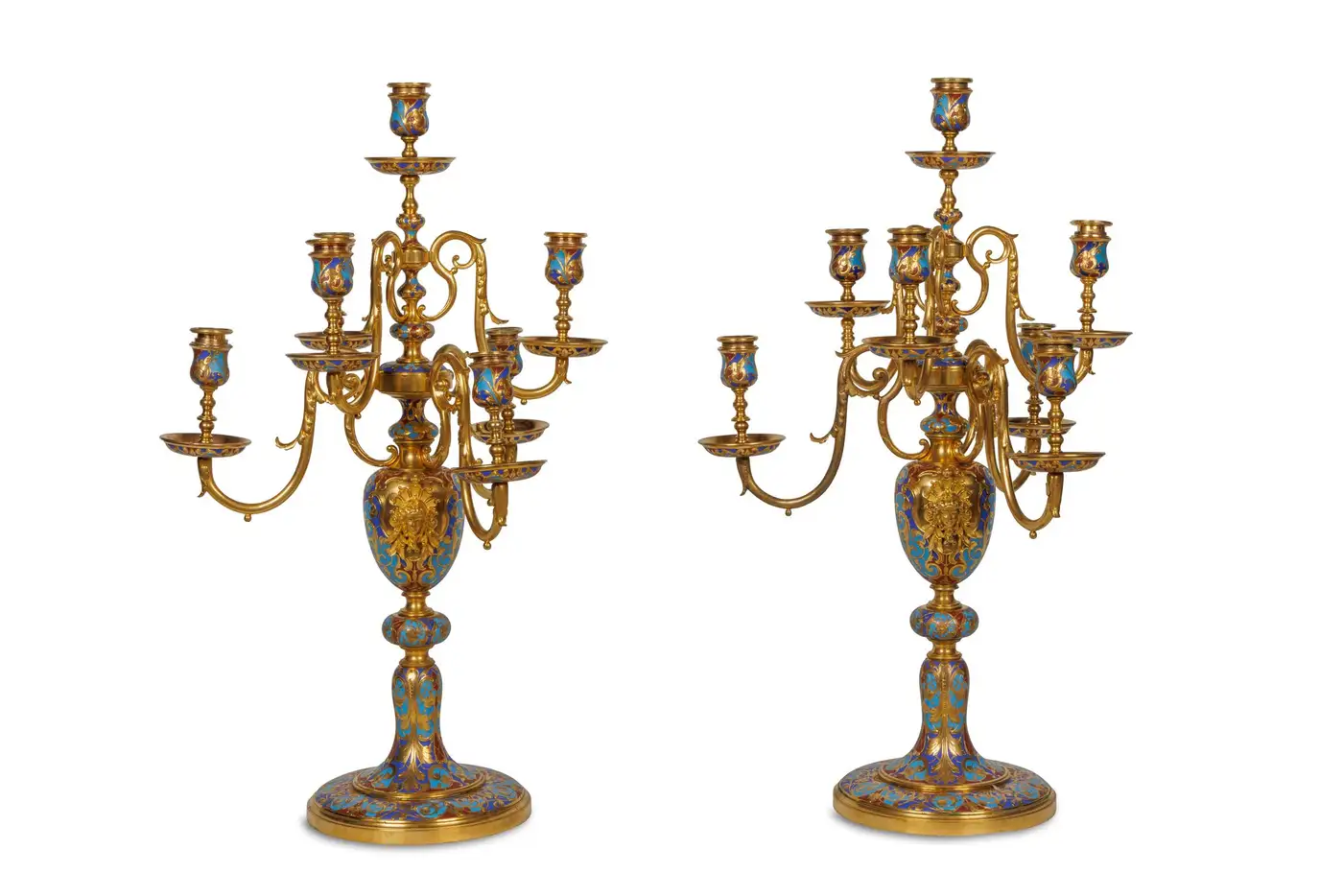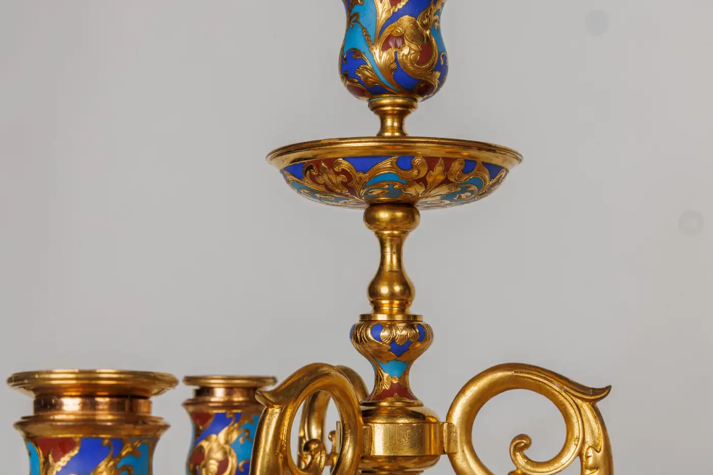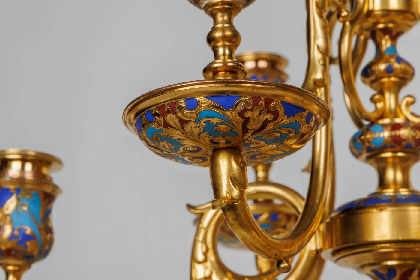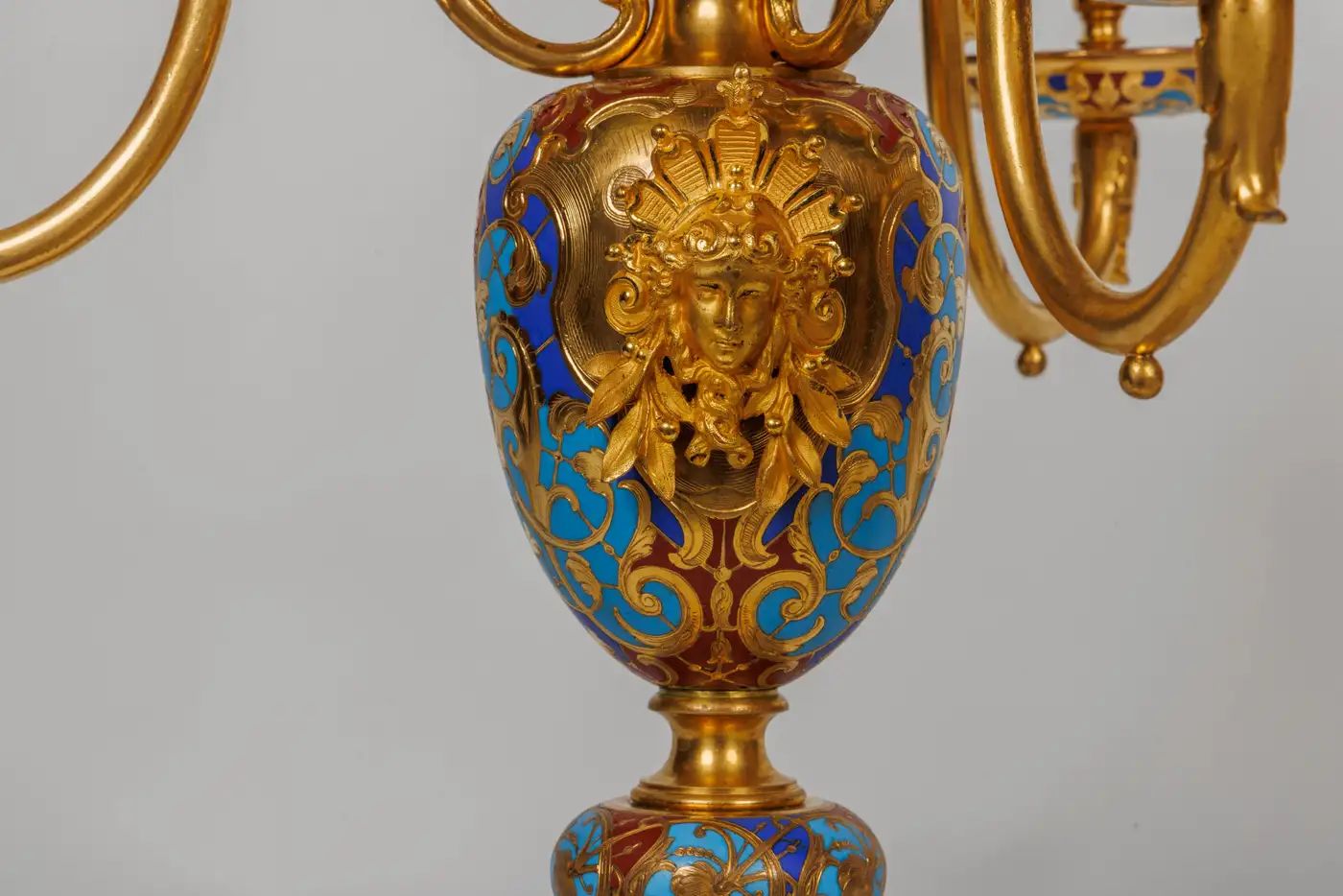 - Each candelabrum is a triumph of design and craftsmanship, featuring sumptuous champlevé enamel in vibrant shades of blue, red, and turquoise. The intricate patterns, meticulously rendered, echo the exotic influences of the period, bringing a vibrant energy and visual rhythm to the pieces. The ormolu, of unparalleled jewel-like quality, is richly gilded and finely chased, creating a dazzling interplay of texture and detail.