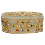 The Art of Mughal Luxury: At the heart of this piece lies a finely carved jade box, crafted from the most esteemed jade, a material revered for its spiritual and physical properties. The jade’s soft green hue, polished to a lustrous finish, provides the perfect canvas for the intricate artistry that adorns its surface. The craftsmanship displayed here is nothing short of extraordinary, reflecting the meticulous skill and dedication of the artisans who worked under the patronage of the Mughal emperors. - Gold Mounts: