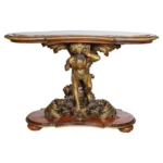 • The base, a testament to the visionary Ludovico Pogliaghi of Milan, elevates this console table to the realm of sculptural poetry. Departing from convention, a young triton assumes a dynamic pose, ready to gracefully spring forward, replacing the traditional supporting figures found in 17th-century Venetian serving tables. This reinterpretation not only defies expectations but introduces a kinetic elegance, with the triton standing proudly on a scrolling foliate base that seamlessly transitions into a shaped foot supported by dignified bun feet.