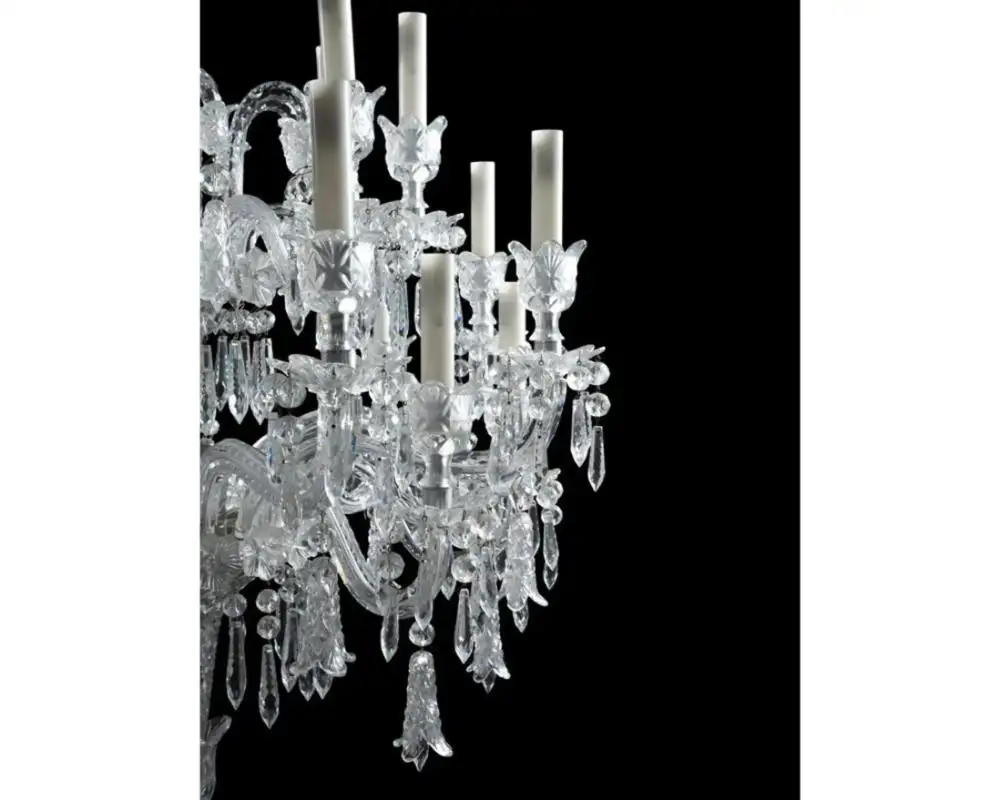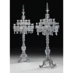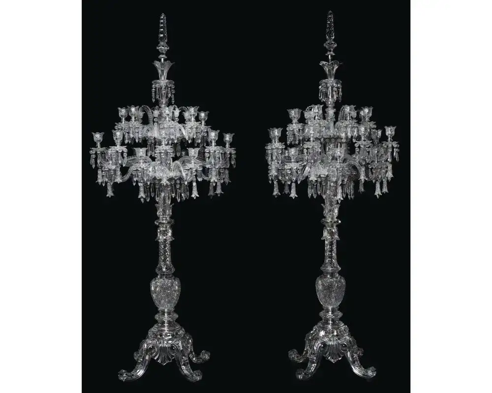 • In 1867, Tsar Alexander II visited the Exposition Universelle in Paris and fell in awe in the sight of Baccarat’s stand which showcased a 10 meter high twenty-four candelabrum, tables, an immense fountain more than seven meters high, vases and chandeliers. This visit initiated a long-lasting relationship with the firm and resulted in a series of commissions by the Romanov family. For example, in 1867, the Tsar ordered for the private apartments of his wife, Tsarina Maria Alexandrovna a series composed of a pedestal table, a fountain and a twenty-four candelabrum. A pair of monumental candelabra, first exhibited at the Exposition Universelle of 1878 were commissioned by the Tsar in 1896. Another pair of of the same design of the later candelabra was sold Christie’s New York, 13 April 2016, lot 21 ($1,325,000).