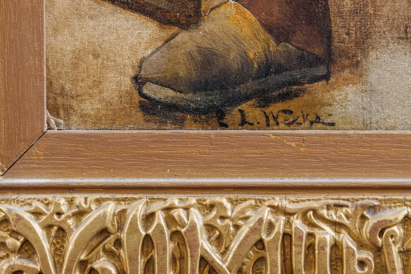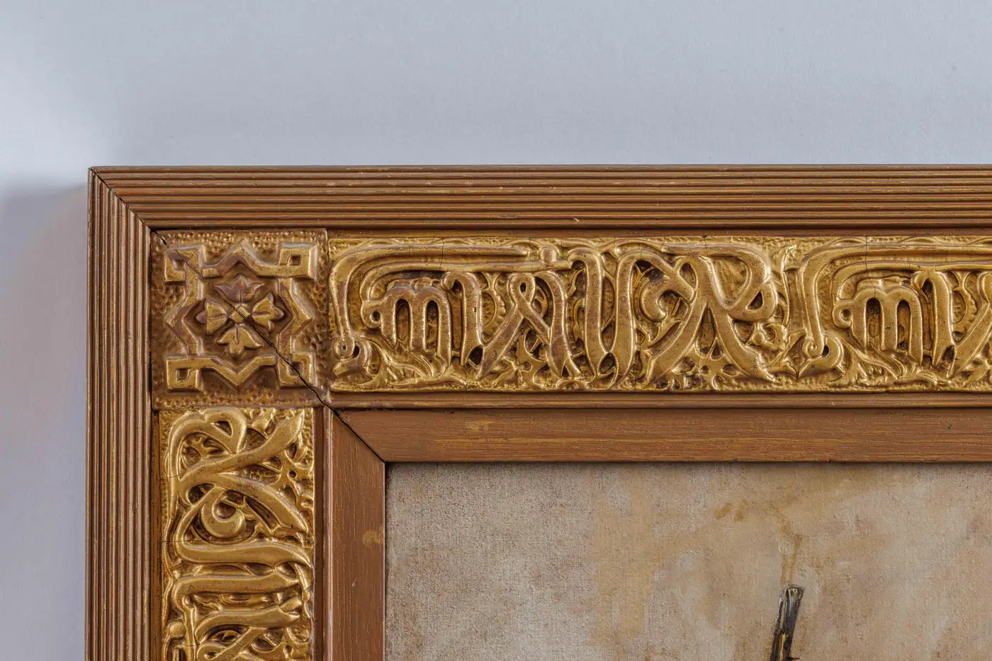 - In original Arabic calligraphic inscribed gilt-wood frame.