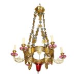 - This one of a kind, exceptionally elegant, jewel-quality chandelier, is one of the most beautiful chandeliers we have seen in this style. The ormolu is phenomenal, the enameled glass balls on the chain are beautiful, and of course the ruby red glass plates fit perfectly.