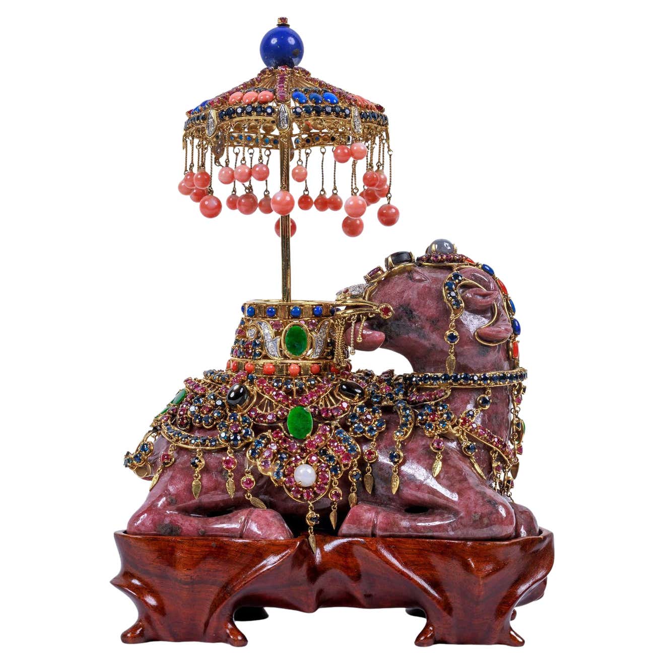 - A very good quality and unusual gold mounted jeweled object, depicting a seated camel carved from rhodonite, adorned with jewels and semi precious stones throughout including: