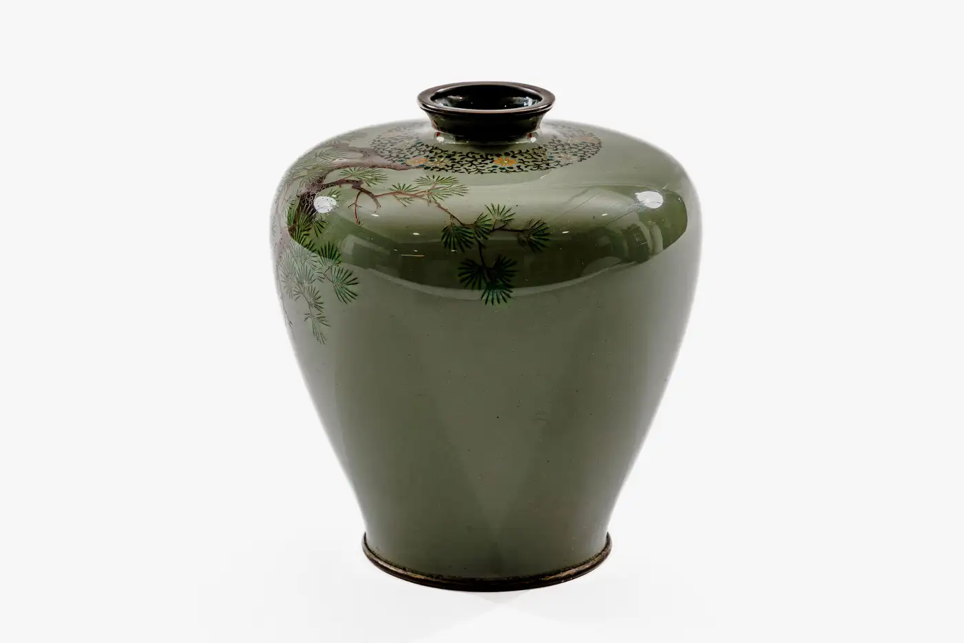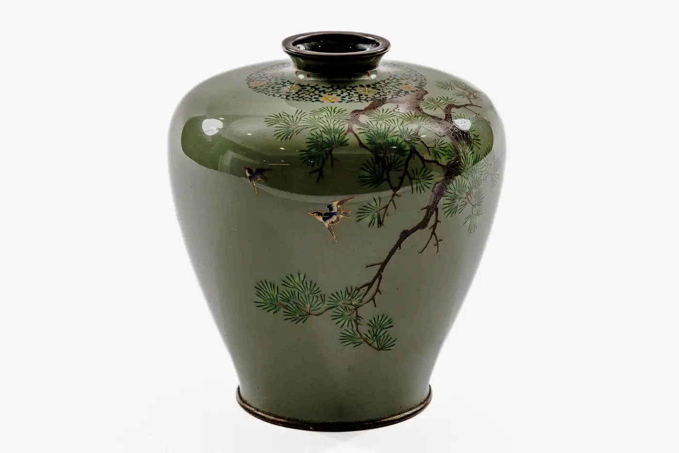 - The surface is elegantly composed with sweeping pine branches extending across the body, accompanied by finely rendered birds in flight. The decoration is executed with remarkable subtlety, employing both silver and gold cloisonné wire: silver wire articulates the foliage with quiet precision, while gold wire defines the birds, creating a nuanced interplay of tone, texture, and light. This deliberate contrast reflects a level of artistic intention and technical mastery associated with the highest tier of Meiji period production.