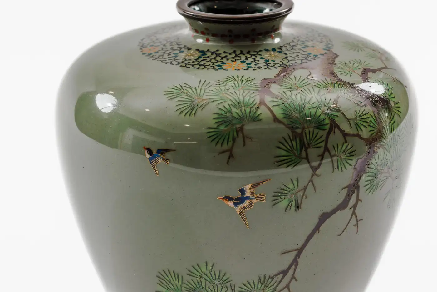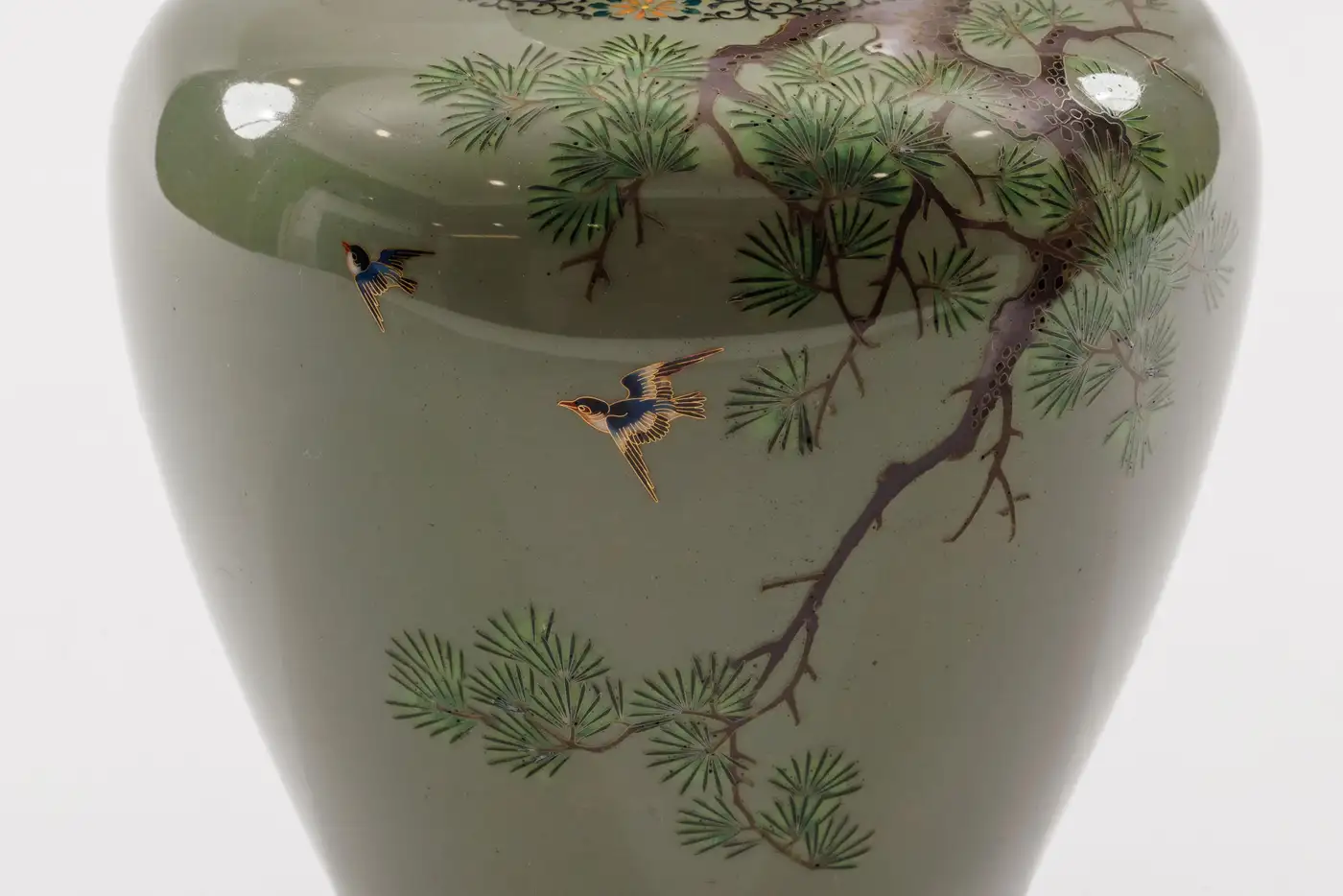 Exquisite Cloisonné Enamel Vase Birds Pine Celadon Ground, Attributed Hayashi