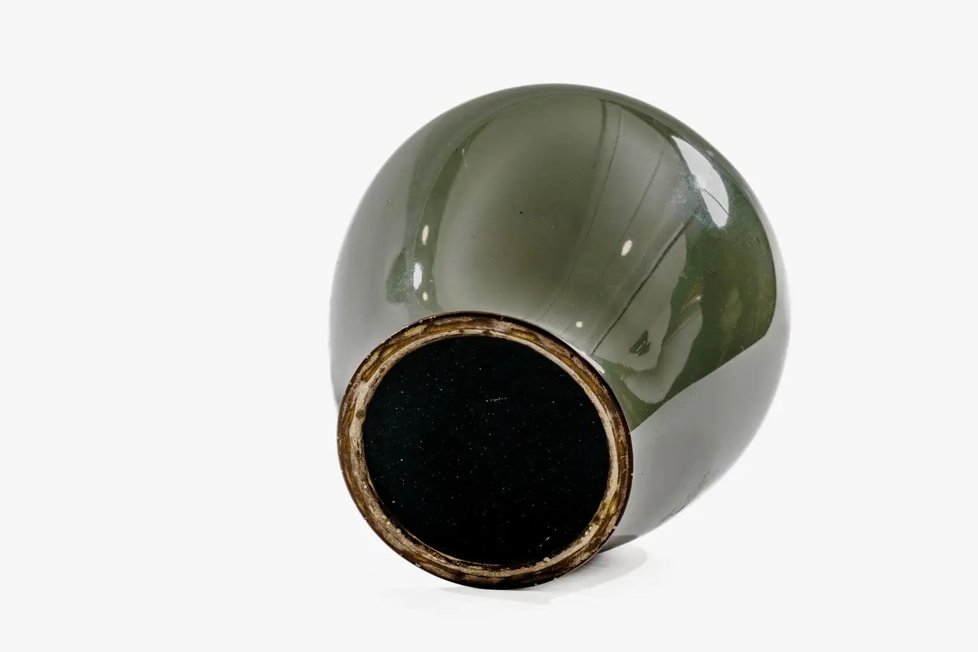 - Encircling the shoulder is a continuous band of scrolling karakusa ornament interspersed with stylized blossoms, executed with exceptional clarity and balance. The composition as a whole is notably restrained, allowing the luminous celadon ground to function as an atmospheric field—an approach characteristic of the most refined cloisonné works, where elegance is achieved through control rather than density.