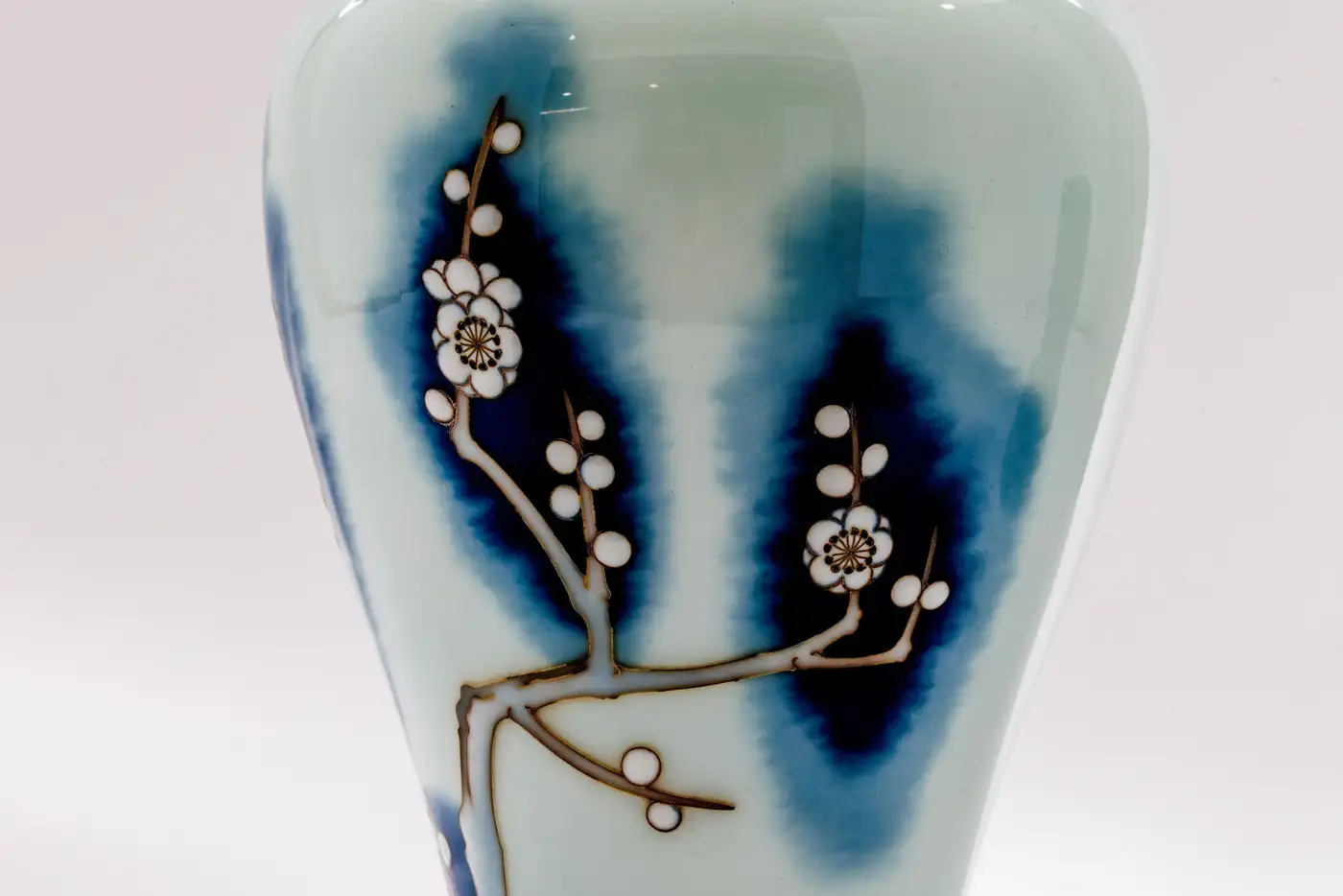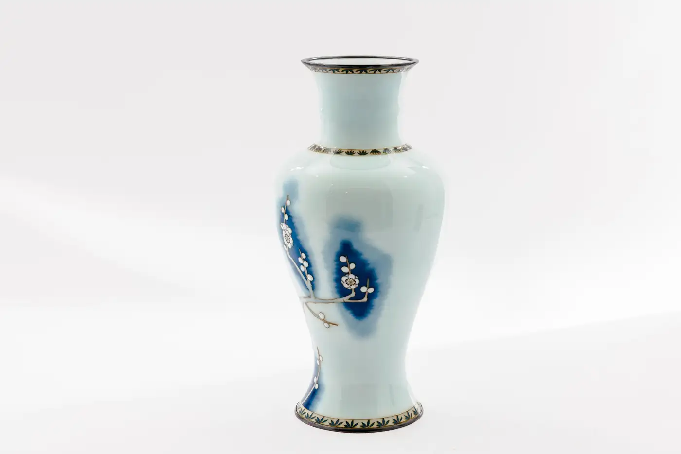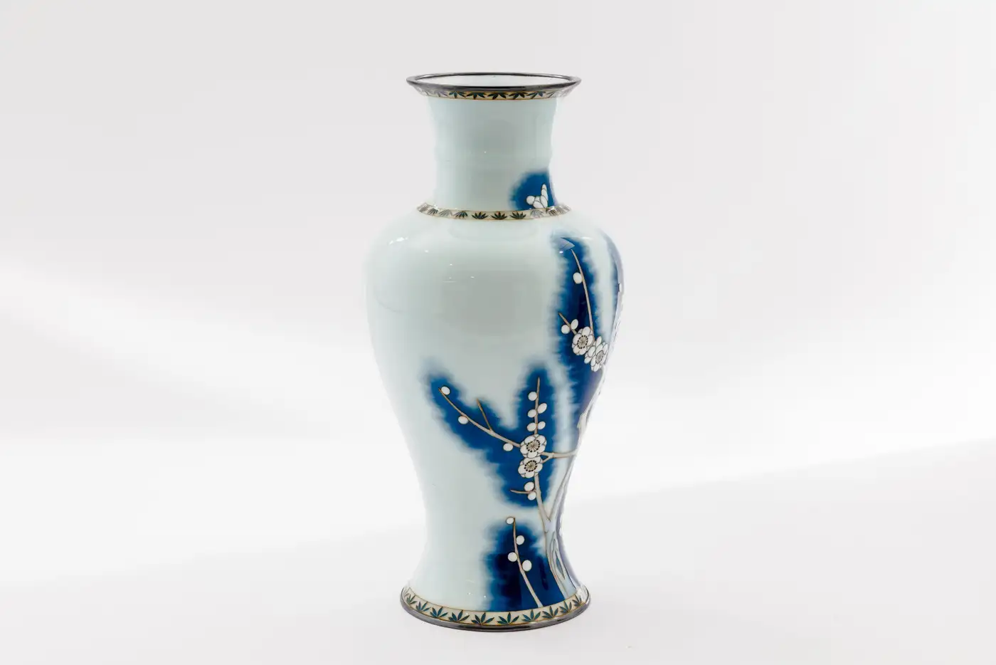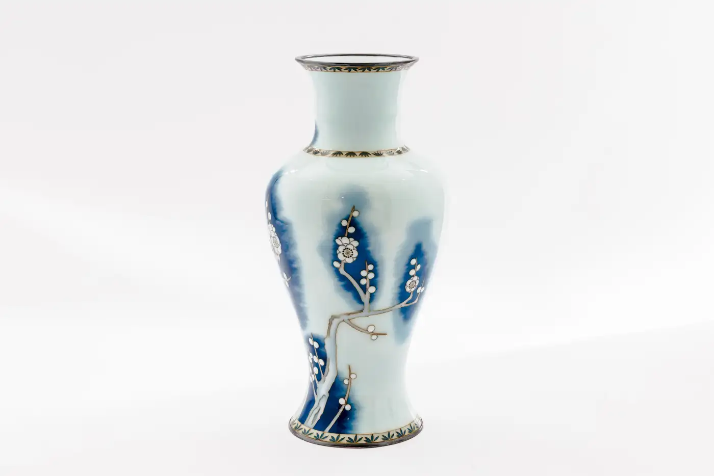 • The surface is decorated with a blossoming plum tree, its branches articulated in fine gold wire and set against a softly diffused ground of deep cobalt blue dissolving seamlessly into milky white. This atmospheric transition is achieved through wireless enameling, allowing for uninterrupted tonal gradation rarely encountered in traditional cloisonné and imparting a painterly, almost ink-like quality to the composition.