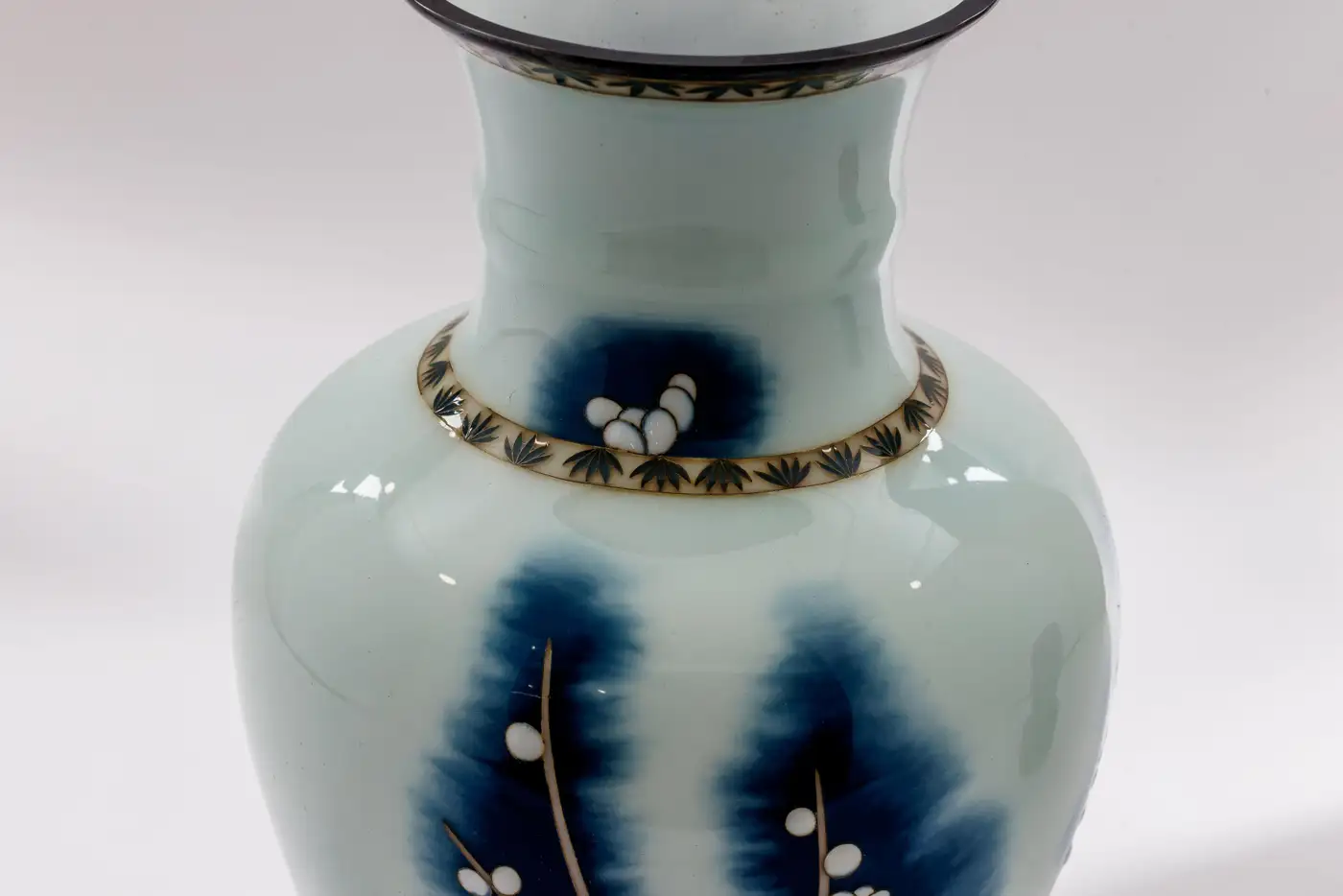 • Further enhancing the surface is the use of moriage, or raised enamel, visible in the blossoms and select details where the enamel is subtly built up in relief to create dimension and texture. The successful integration of wireless enameling and moriage decoration reflects a high level of technical sophistication and control, seldom achieved within a single work.