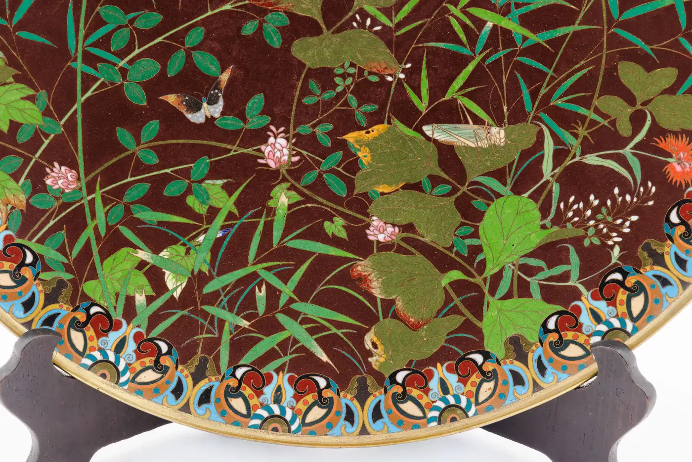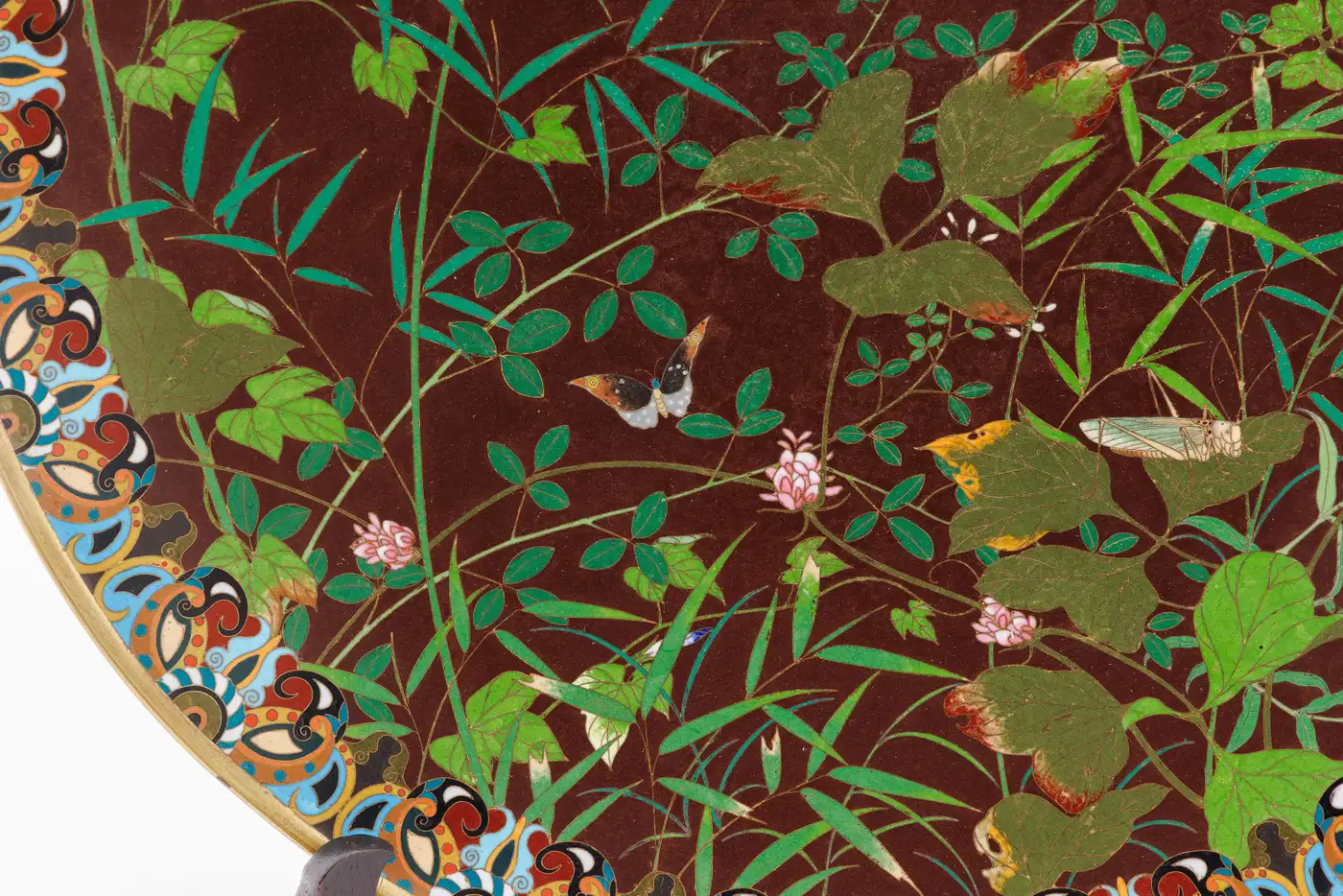 - The technical execution is of a high order. The cloisonné wirework is fine and controlled, allowing for crisp delineation of forms, while the enamel application achieves subtle tonal variations across both the organic and decorative elements. The insects, in particular, reveal a confident and highly skilled hand, their forms animated with careful attention to both movement and detail.