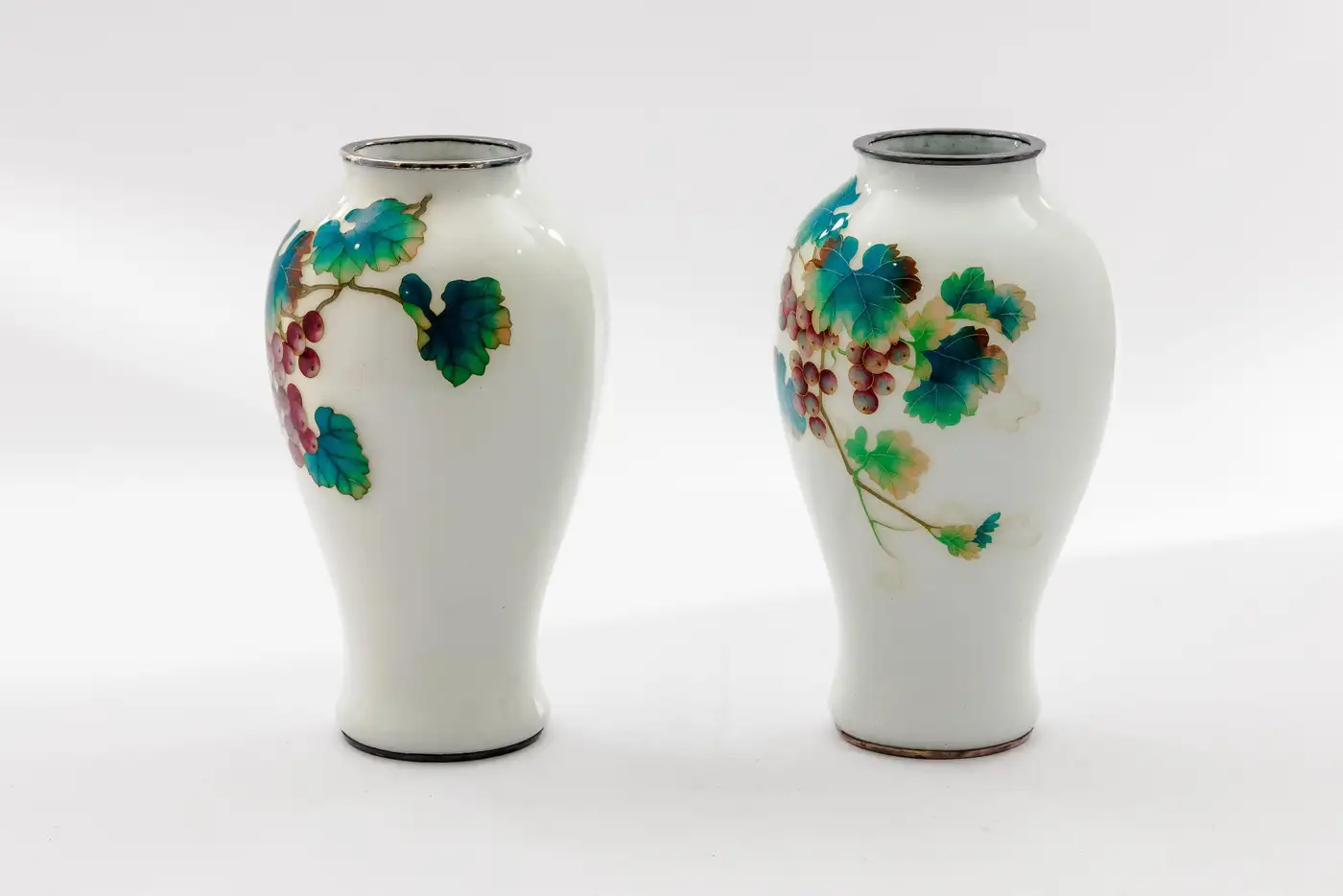 Fine Pair of Japanese Cloisonné Enamel Vases by Ando with Grapes on White Ground