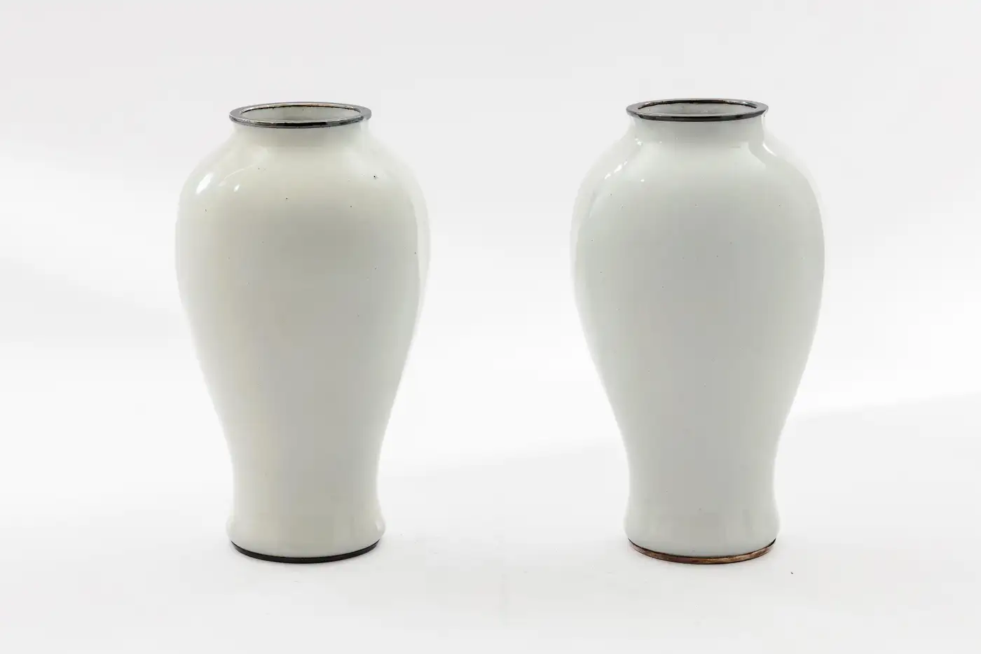 - A refined and elegantly composed pair of Japanese cloisonné enamel vases produced by the Ando Company during the Showa period (1926–1989), exemplifying the workshop’s continued mastery of the medium into the twentieth century.