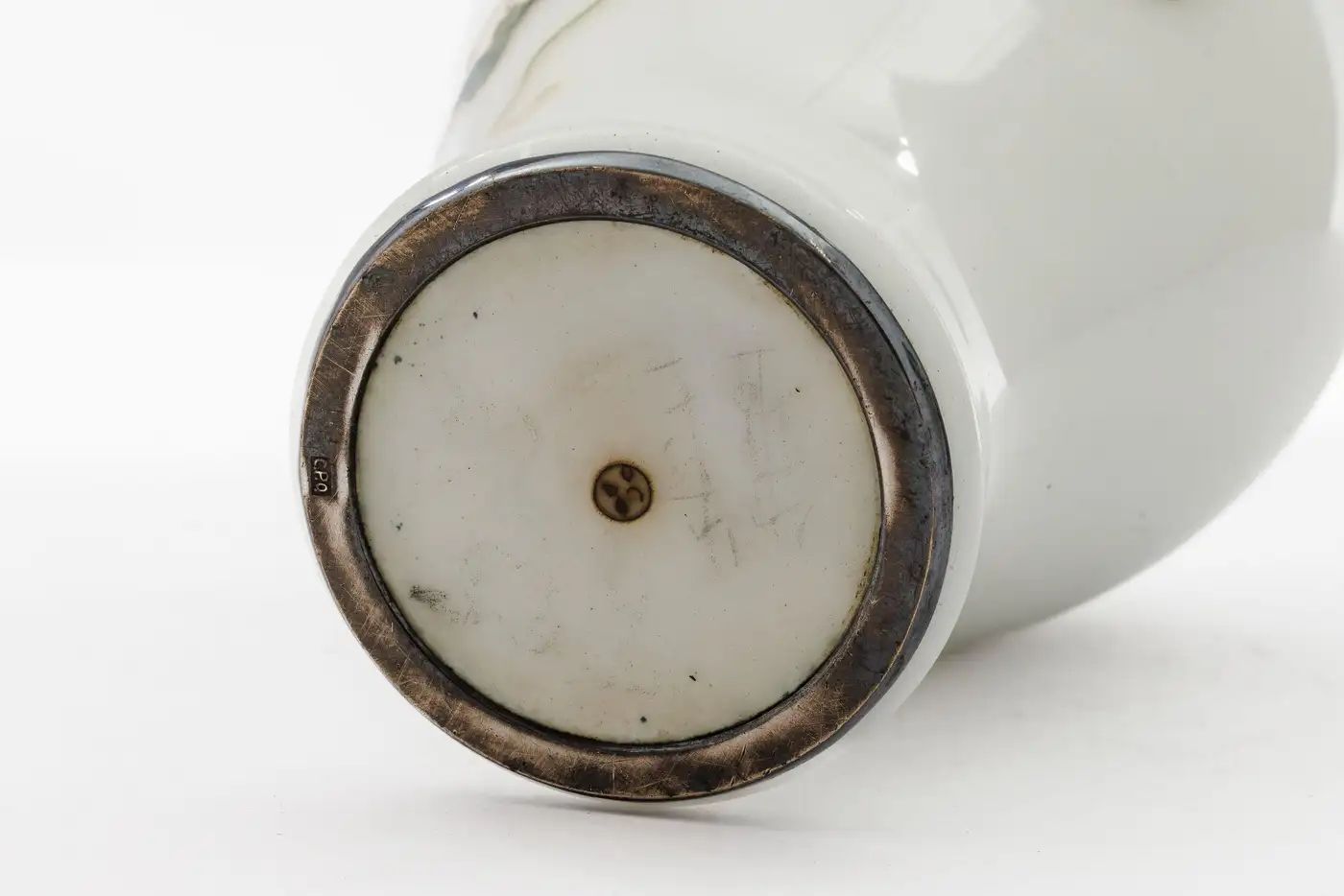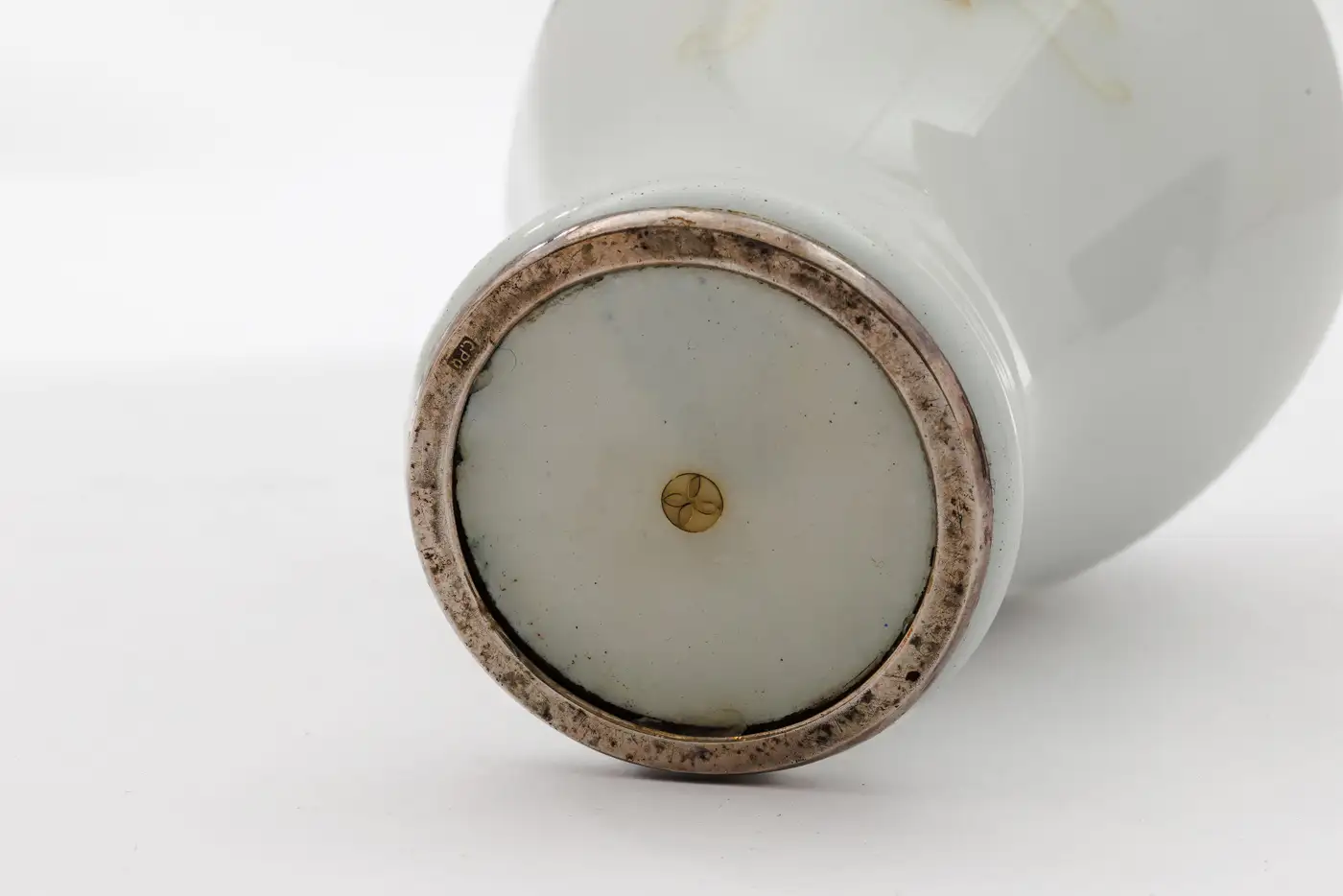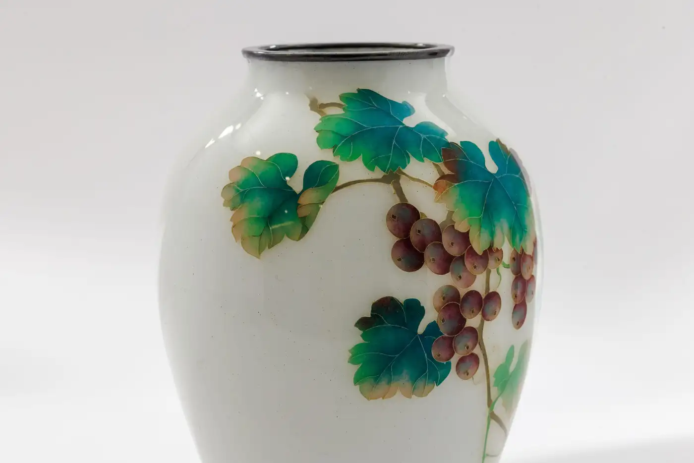 - Particularly noteworthy is the rare and luminous white enamel ground—an unusual and highly desirable feature in cloisonné production. The pristine white surface enhances the clarity and delicacy of the design, allowing the grapevine motif to appear almost painterly in its execution, while also reflecting the technical precision required to achieve such an even and flawless field.