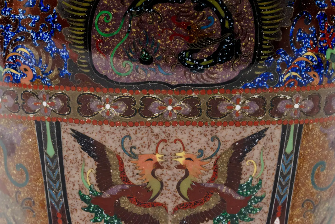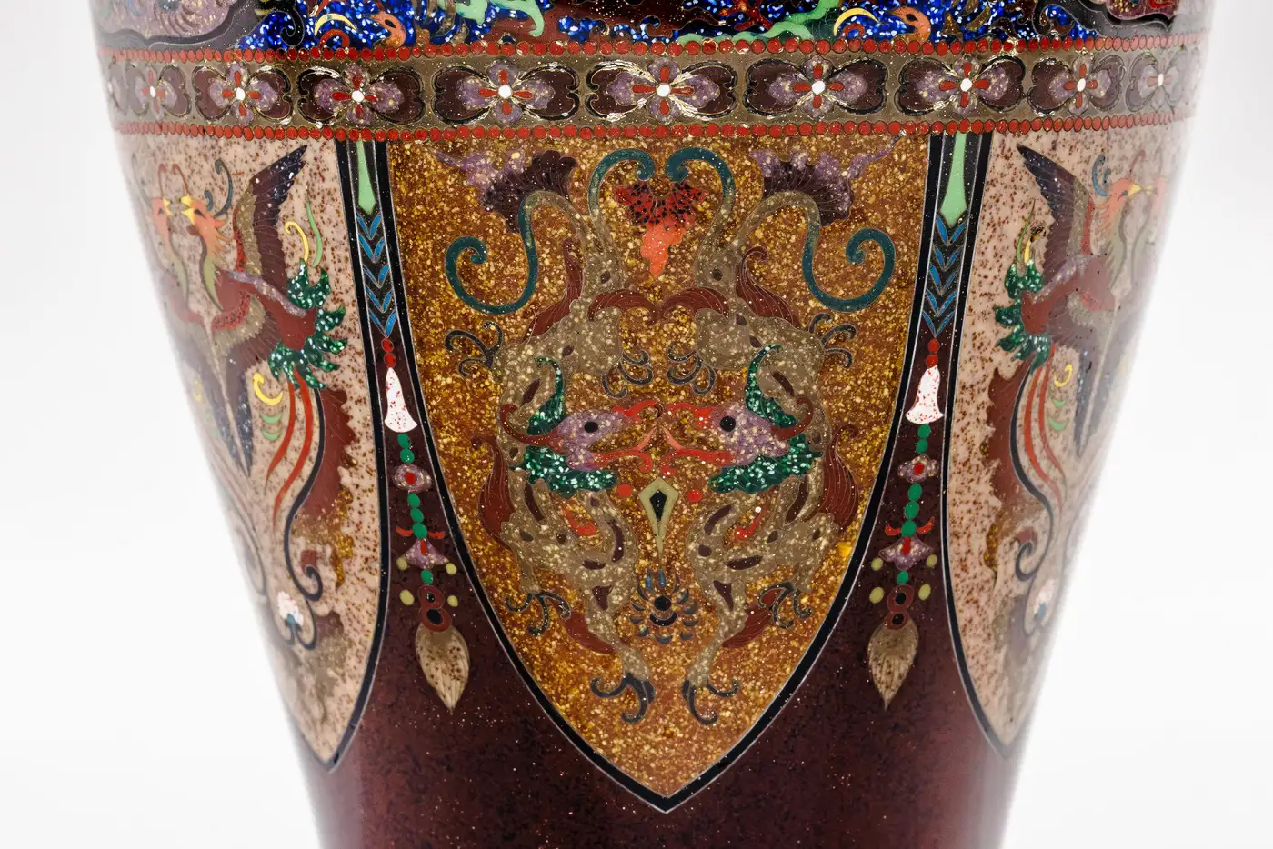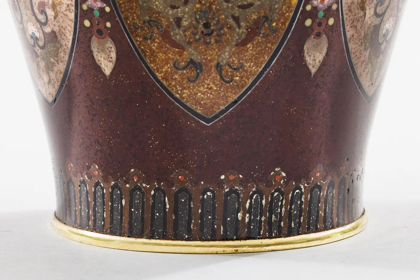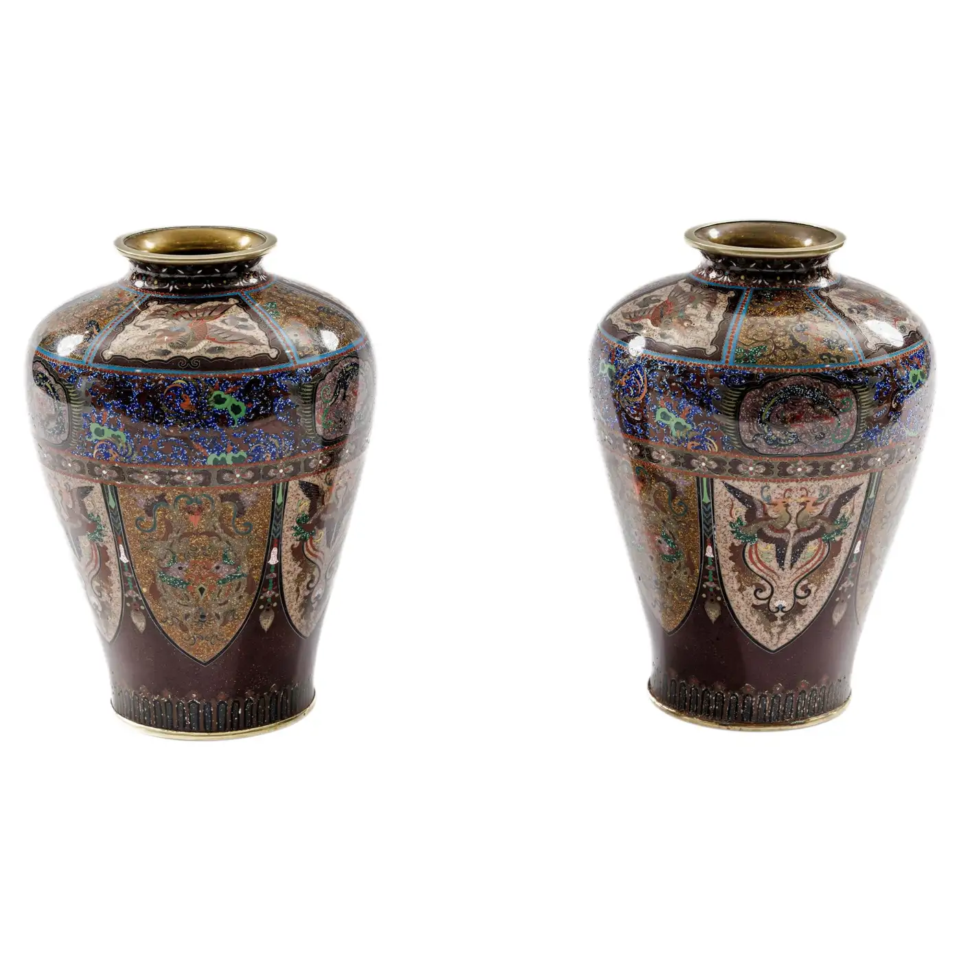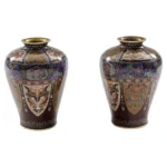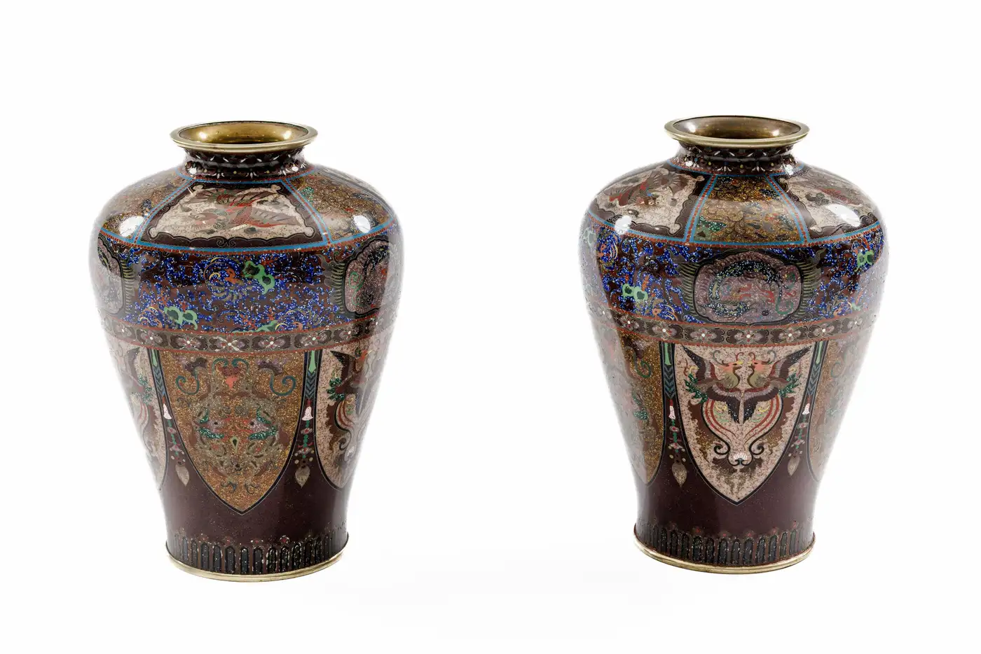 - Although unsigned, it is well documented that many works produced by the Ando studio were originally accompanied by paper or foil labels affixed to the base rather than permanent signatures. Over time, these labels were often lost or deteriorated, and today attribution is frequently made through close stylistic and technical comparison. The present pair aligns closely with known Ando examples in both construction and decorative vocabulary, particularly in the use of aventurine grounds, elaborate panel reserves, and finely articulated mythological imagery.