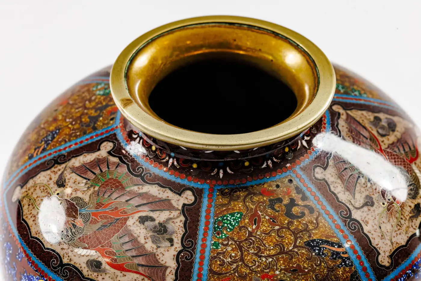 - The precision of the cloisonné wirework, combined with the complexity of the panel arrangement, demonstrates a disciplined and highly refined approach to design. The symmetry of the compositions and the clarity of the decorative program further support attribution to the Ando workshop, whose works are celebrated for their balance, richness, and technical sophistication.