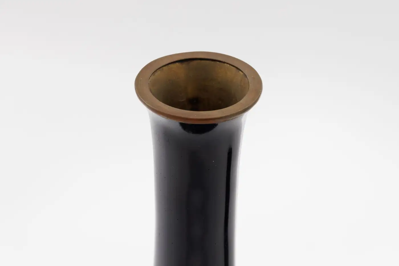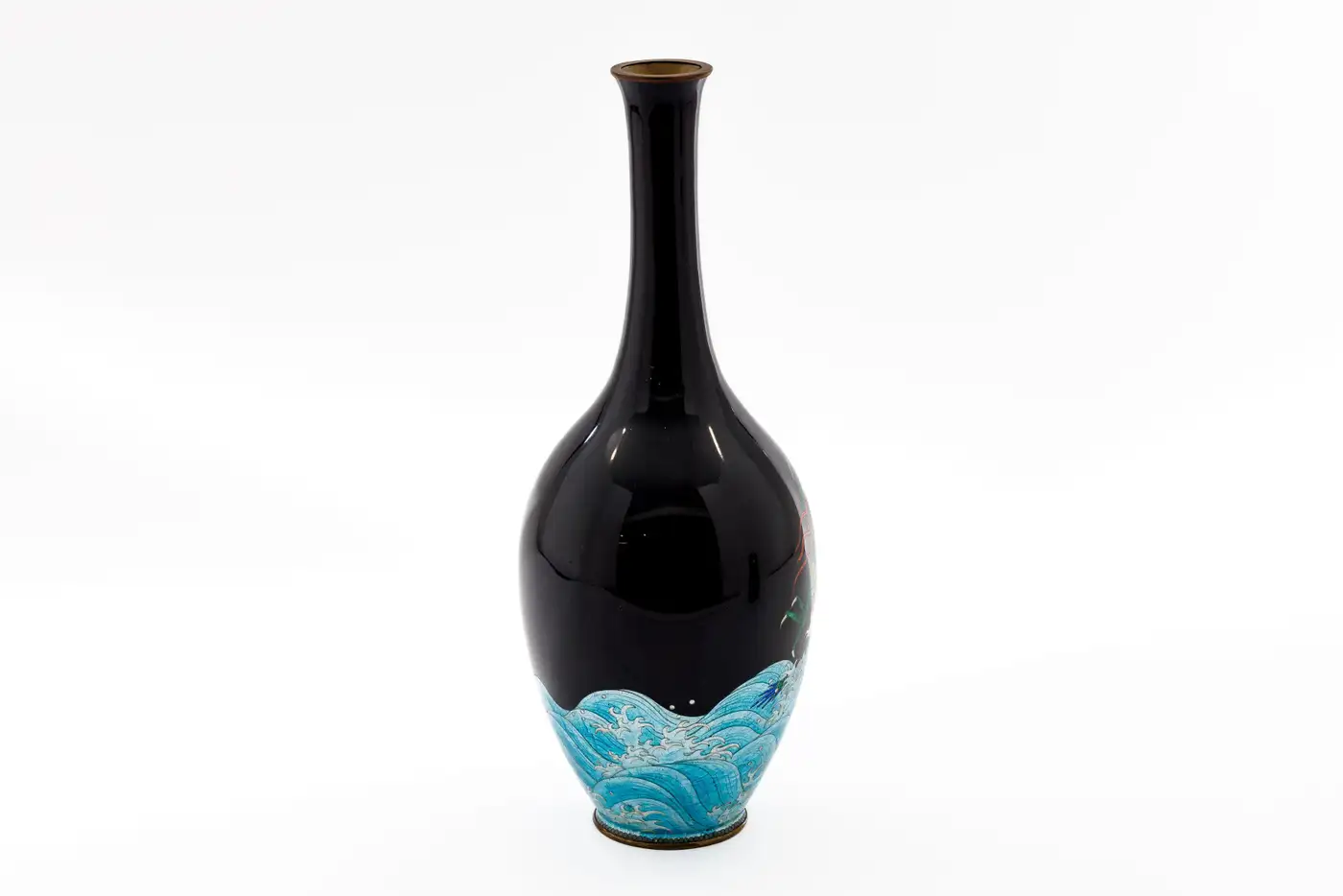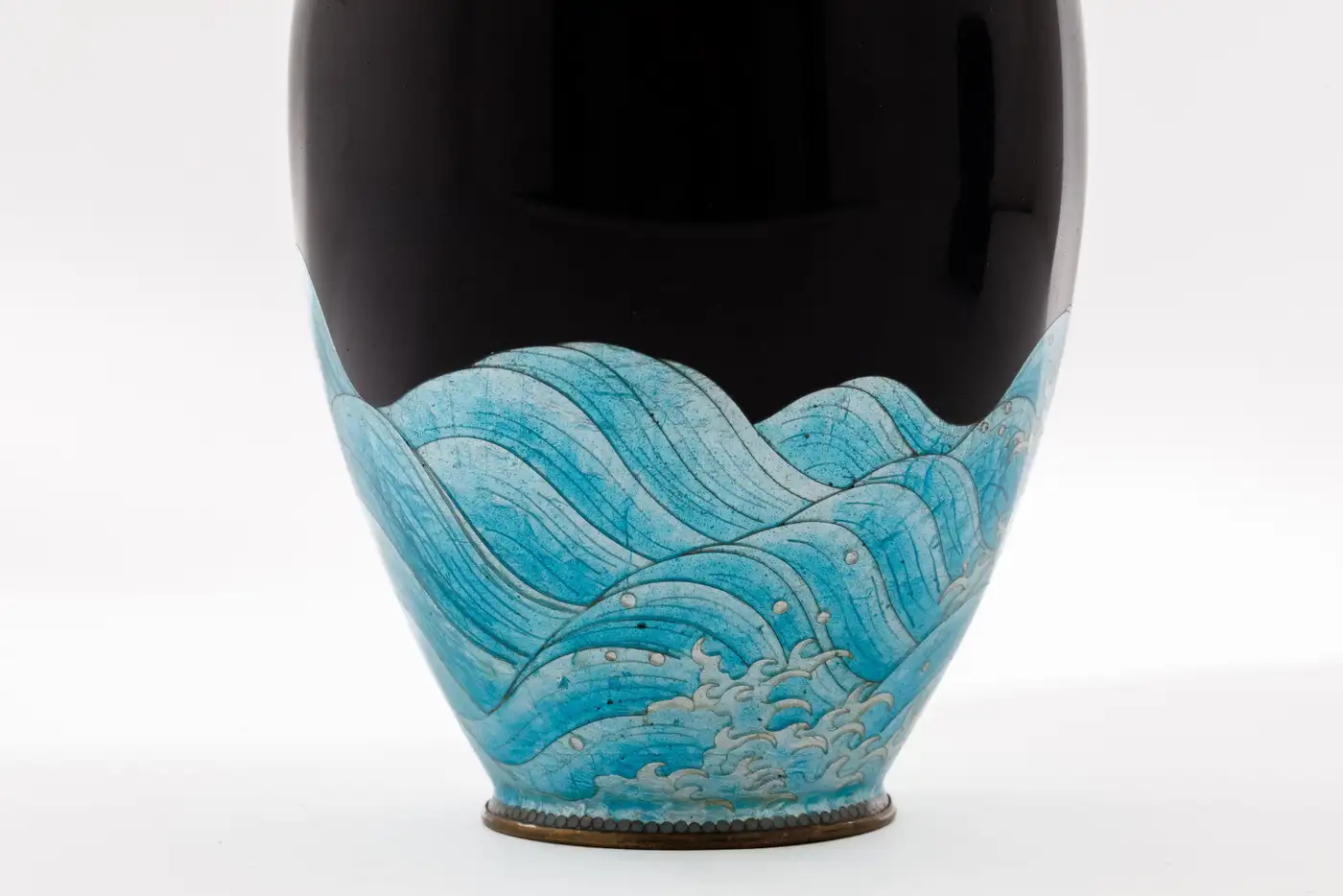 - The vase is executed in the highly specialized ginbari technique, combining translucent and opaque enamels over a silver foil ground. This sophisticated method allows light to penetrate the enamel surface and reflect through the underlying foil, producing a remarkable internal luminosity and subtle tonal variation that animates the entire composition.