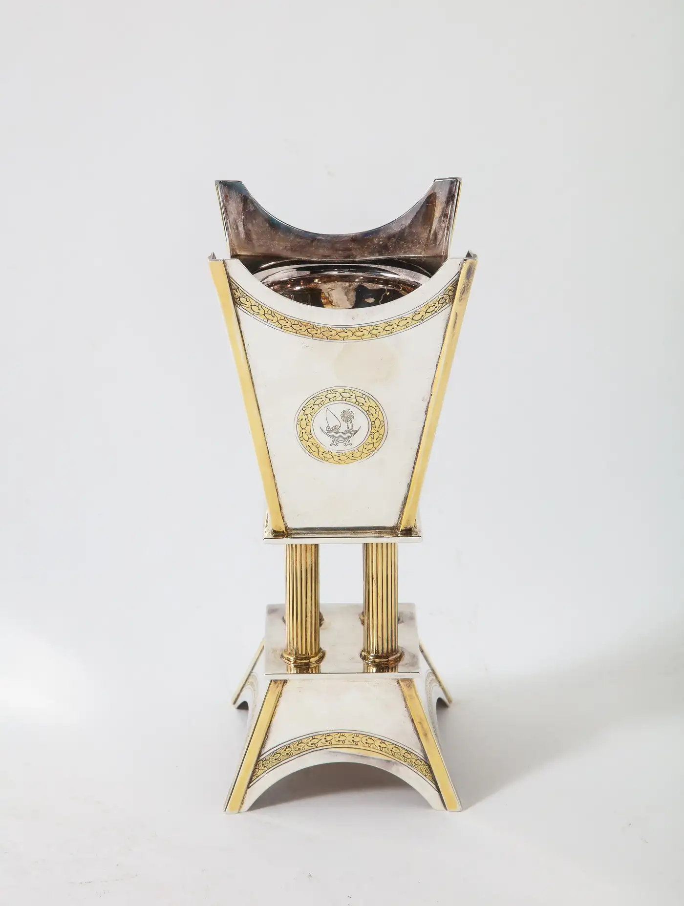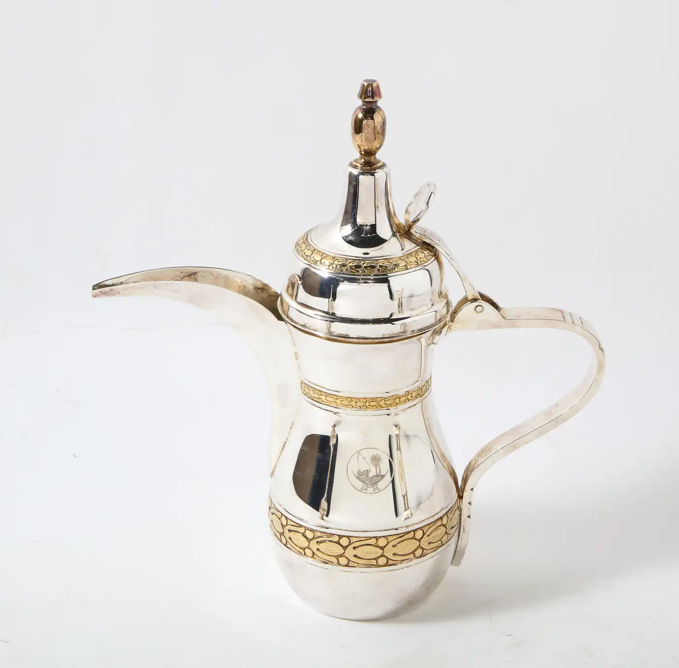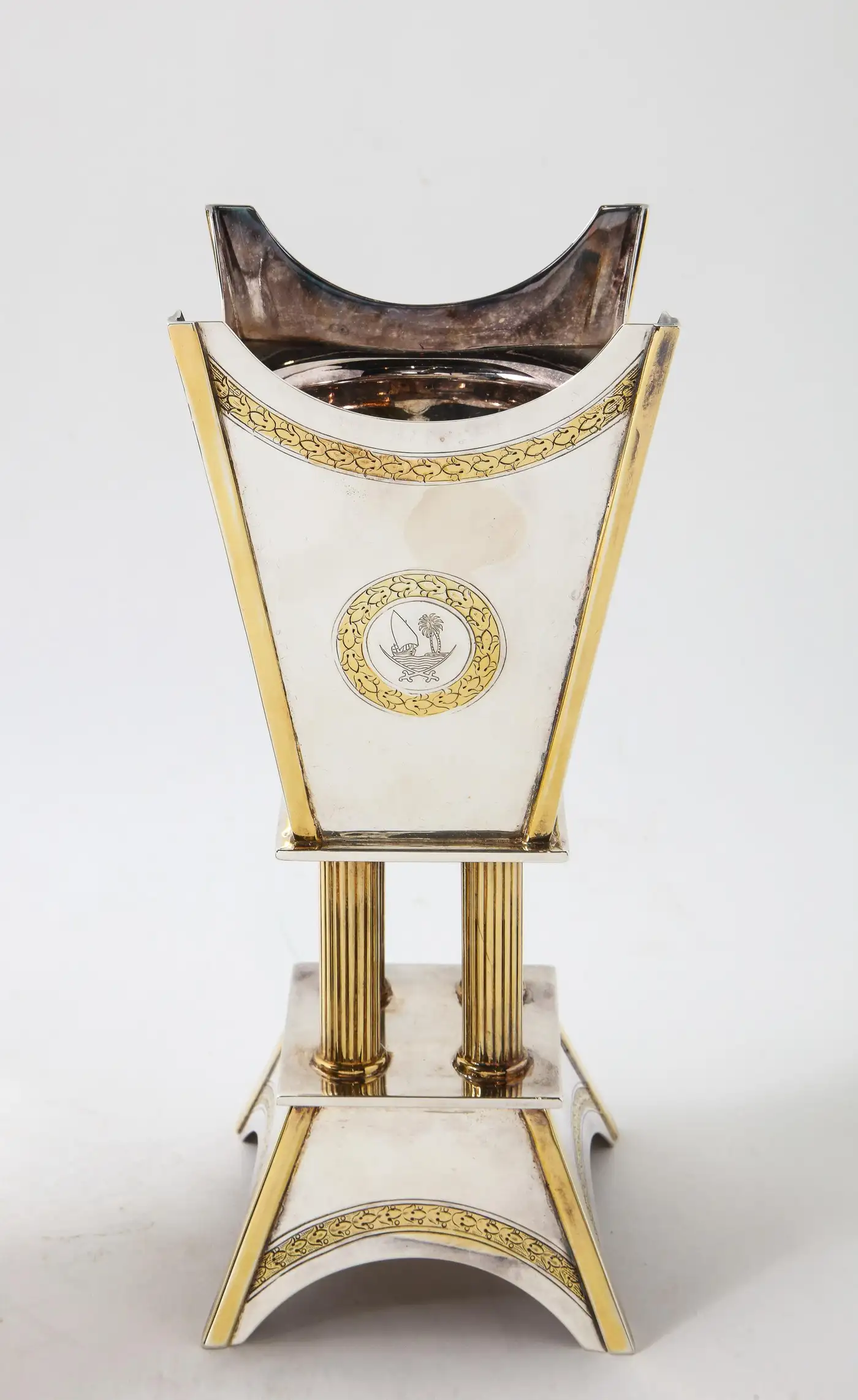 - A Three piece Elizabeth II, silver and silver gilt presentation set, presented to Margaret Thatcher by the Qatar Royal Family. In the oriental style and comprising: a coffee pot dallah chased with foliate bands, the hinged cover with baluster finial, a rosewater sprinkler with similar decoration and an incense bukhur burner on plinth, the stem formed as four columns, the tapering body chased with four foliate wreaths and border, all engraved with the Qatar crest, marked on body and stamped underneath 'Garrard & Co Ltd, 112 Regent Street London W, in a fitted leather case stamped with the Qatari crest and 'State of Qatar'.
