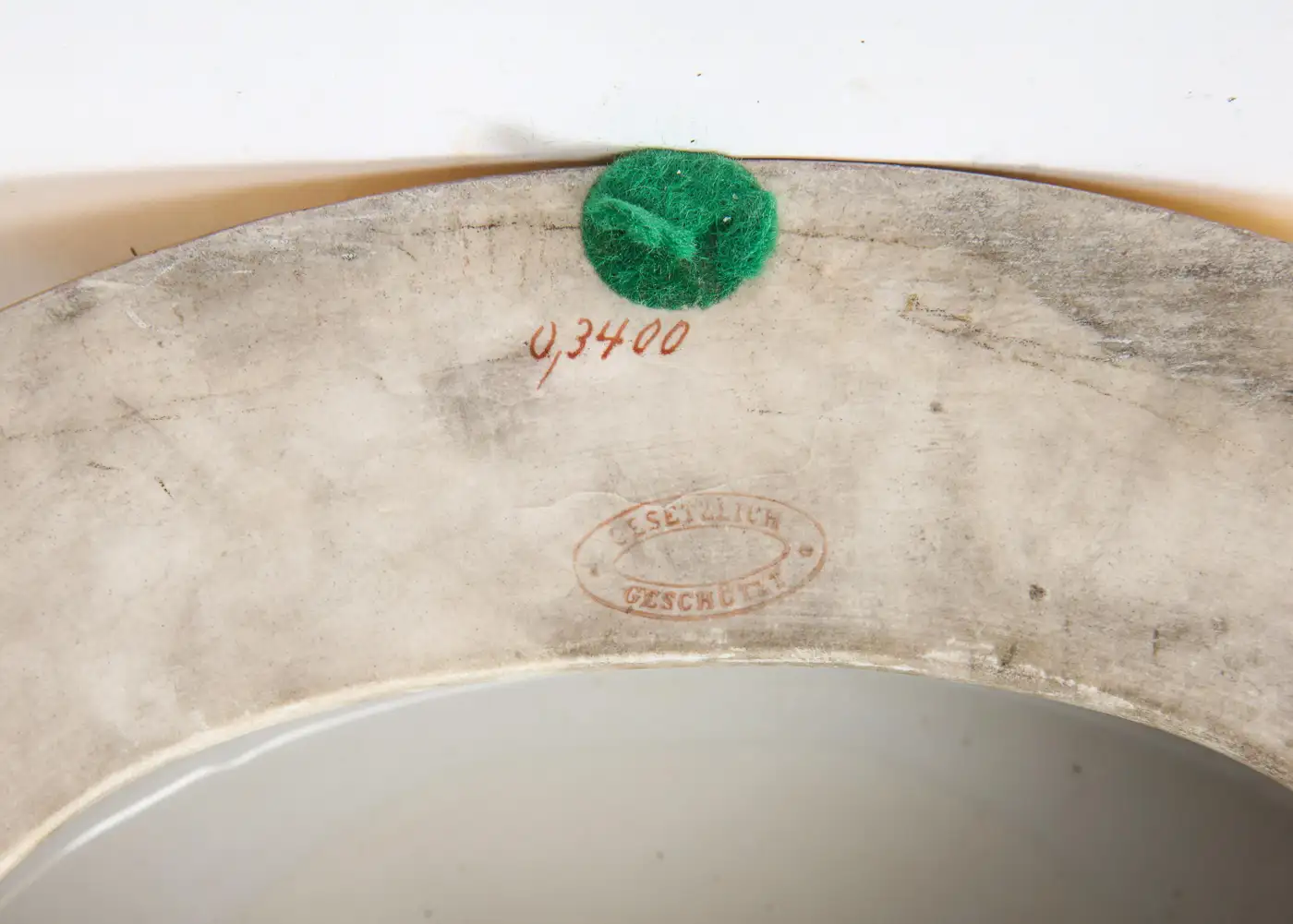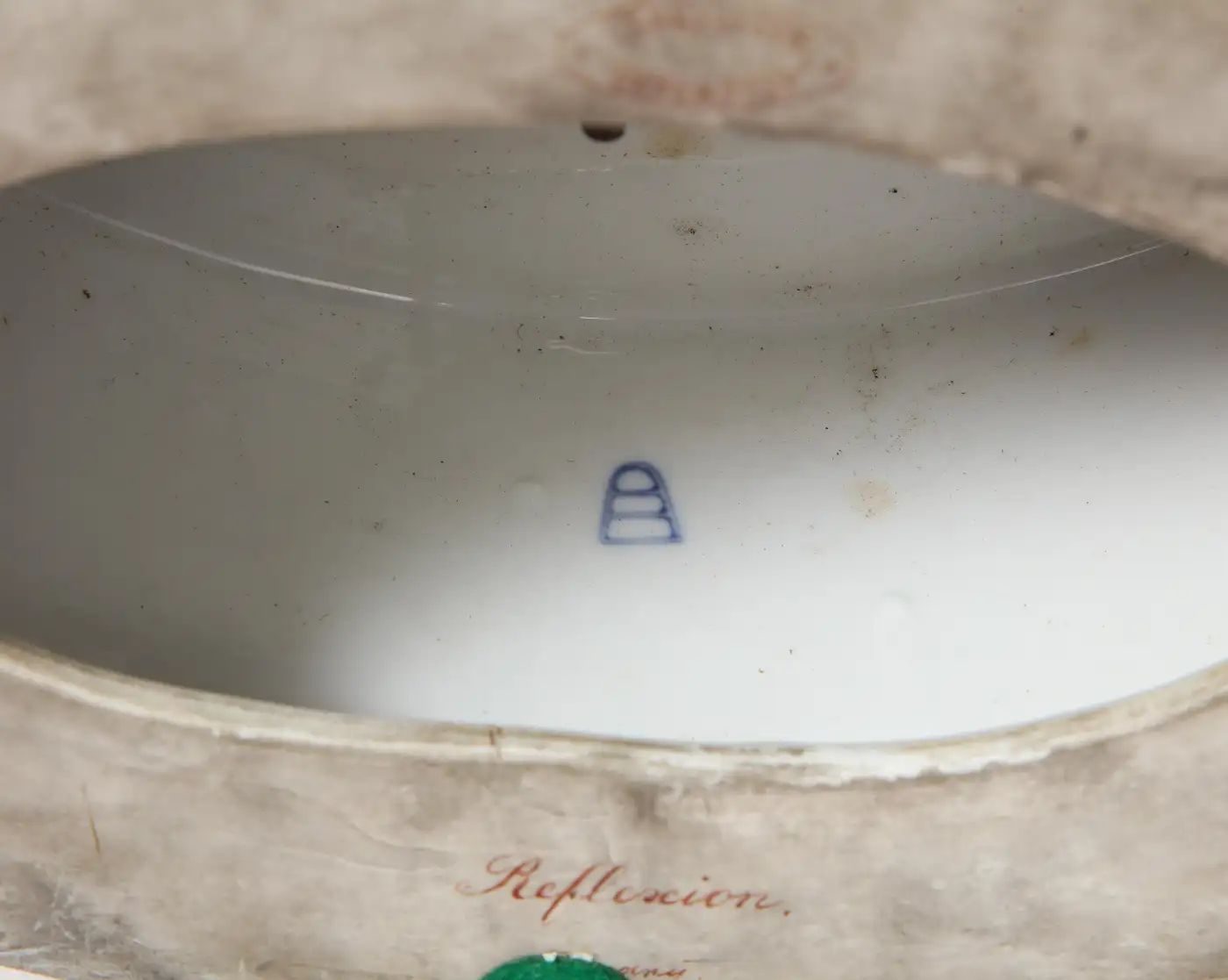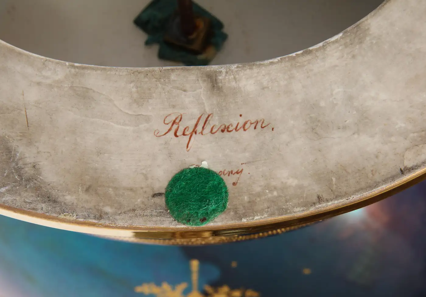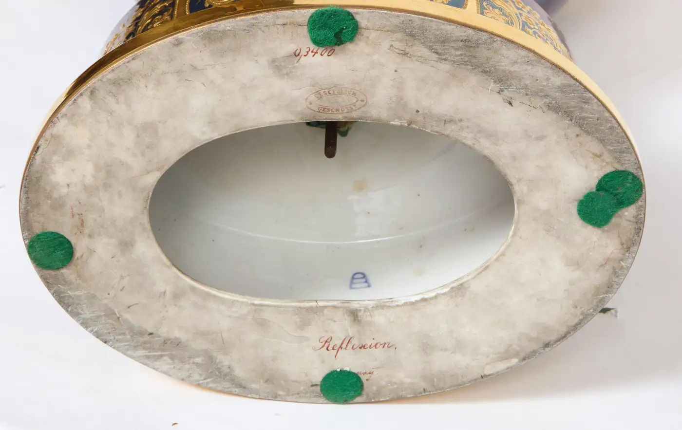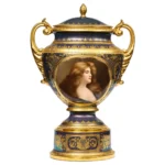 - This Royal Vienna Urn features an exceptional iridescent lustre, of flattened, 2 handled form, having an exquisite female allegorical hand-painted portrait on the front with raised gilt and jeweled, beaded decoration throughout. Set on an oval plinth base with blue beehive mark, script title "Reflescion", and with additional markings.