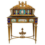 - A rare and important French ormolu/bronze and Sevres style turquoise porcelain jewelry box casket on matching French ormolu/bronze table with Sevres style porcelain plaques.