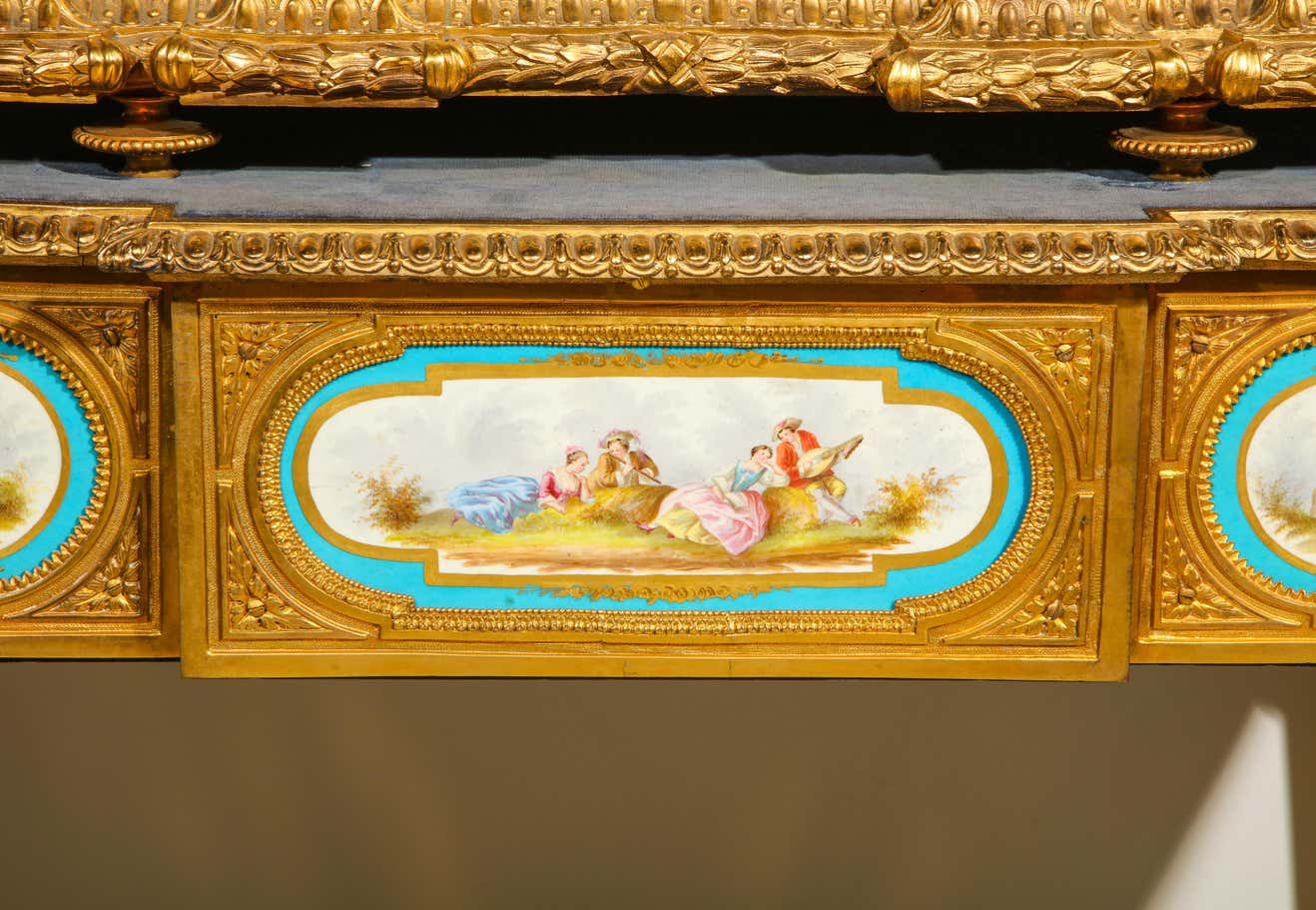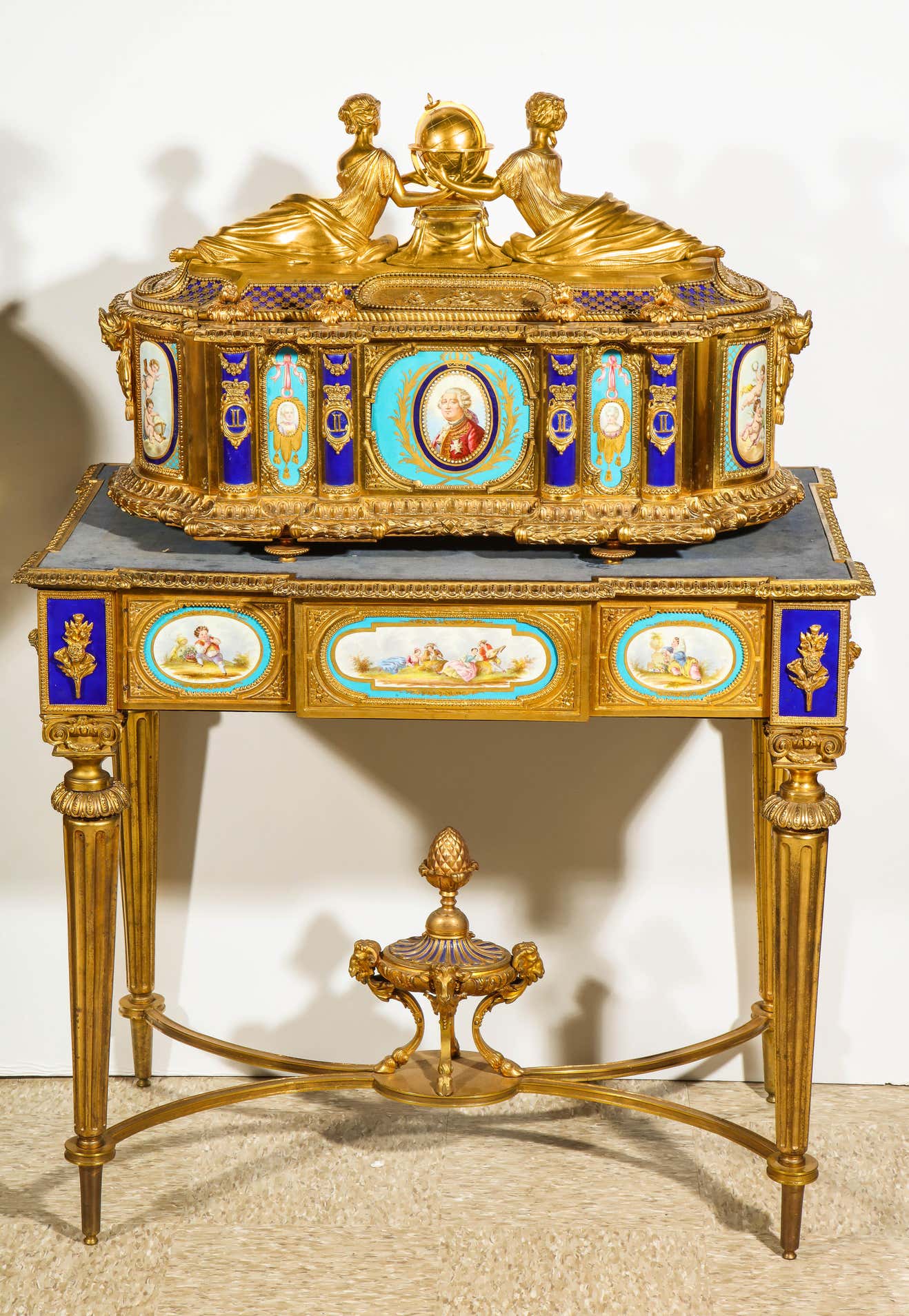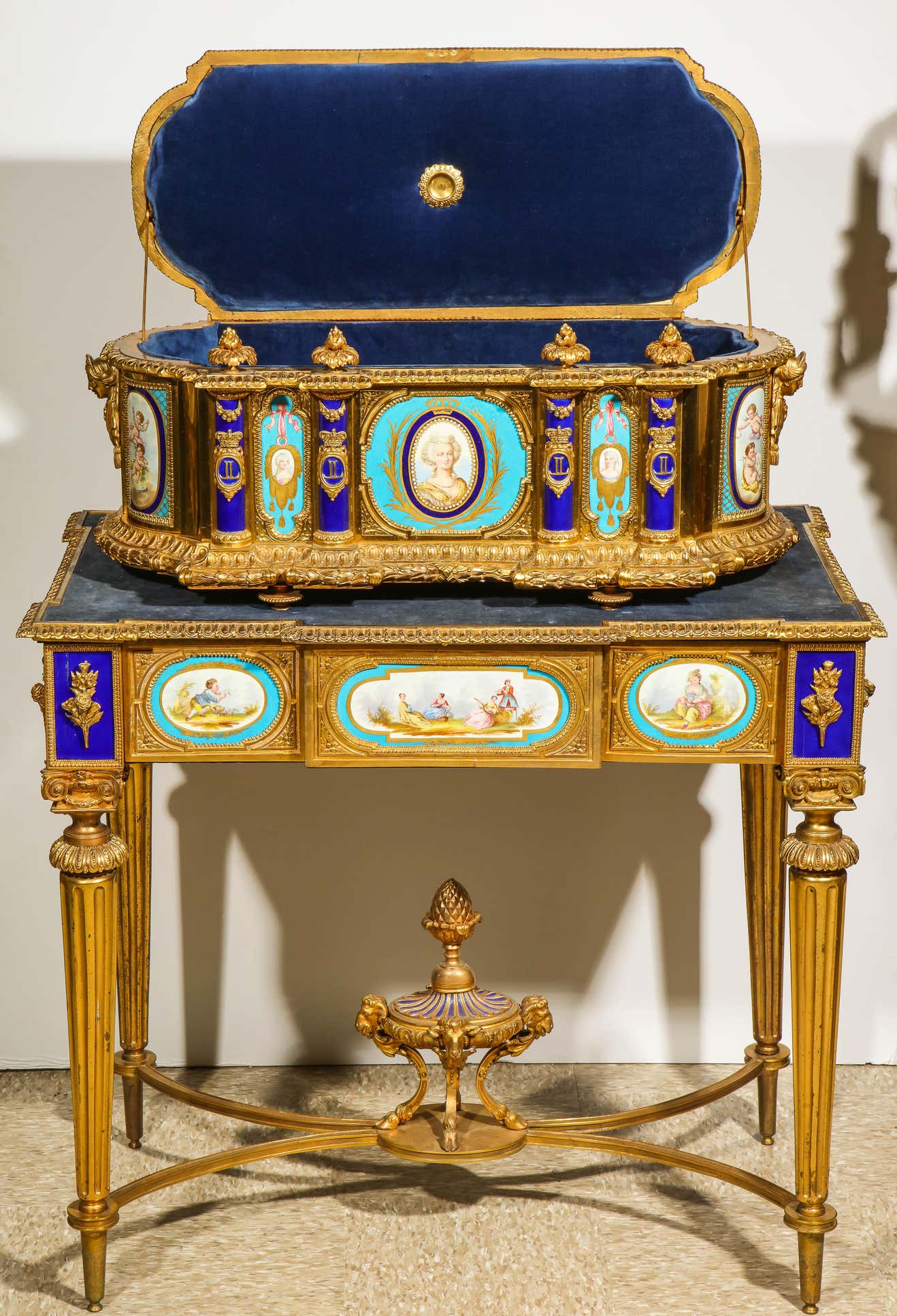 - A rare and important French ormolu/bronze and Sevres style turquoise porcelain jewelry box casket on matching French ormolu/bronze table with Sevres style porcelain plaques.