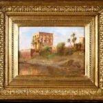 • A stunning oil on canvas by American orientalist painter Frederick Arthur Bridgman. Depicting the The Kiosk of Emperor Trajan , also know as Pharaoh's bed – on Philae on the River Nile. This rare work was painted on Bridgman's first trip to the Middle East which span from 1872 – 1874. In the time Bridgman worked mostly "plein air" – painting on the spot.