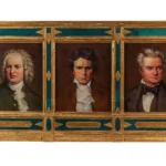 • A very rare and collectible oil on canvas triptych painting depicting portraits of "The Three Bs of Classical Music": Bach, Beethoven, and Brahms – Housed in a fine carved and painted frame in gold gilt and green paint by Frederick Harer, with musical scores underneath each portrait. The paintings appear to be unsigned. The frame is signed on the back "F. W. Harer" and dated 1918.